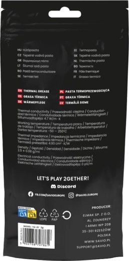 A SAVIO TG-01 minőségi hővezető paszta szén mikrorészecskékkel, amely tökéletesen kitölti a processzor IHS felülete és a hűtő talpa közötti mikroszkopikus egyenetlenségeket. Ennek köszönhetően stabil hőmérsékleteket ér el, és segít a számítógép halk és nagy teljesítményű működésének fenntartásában.