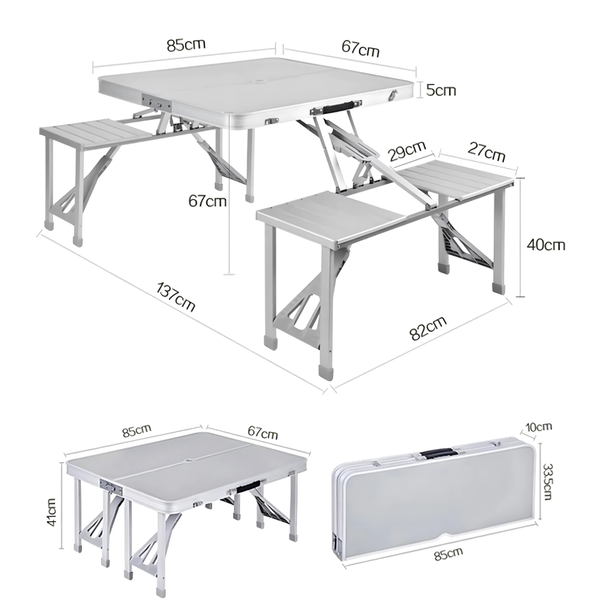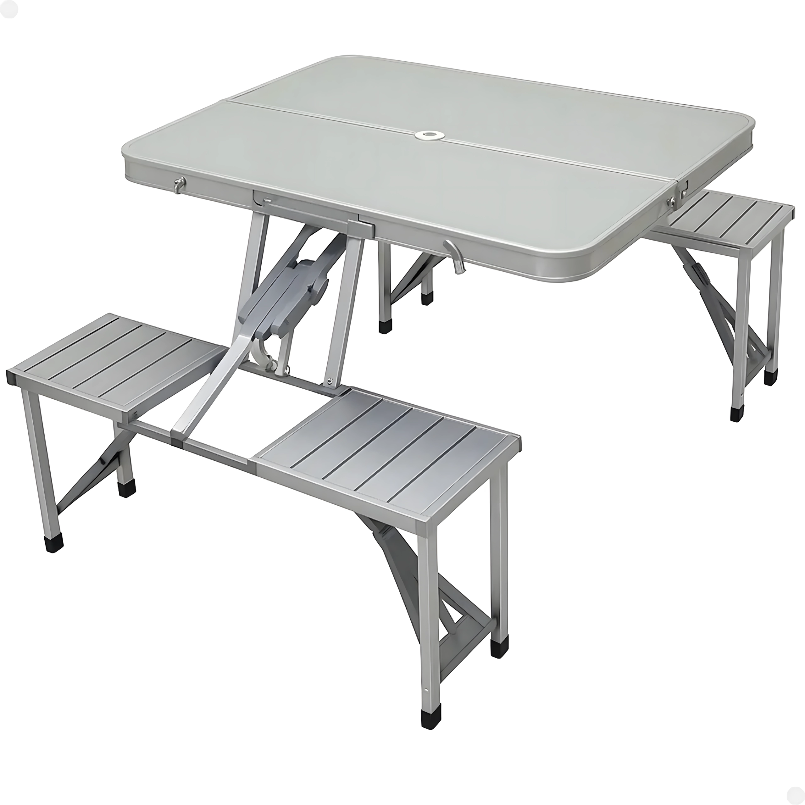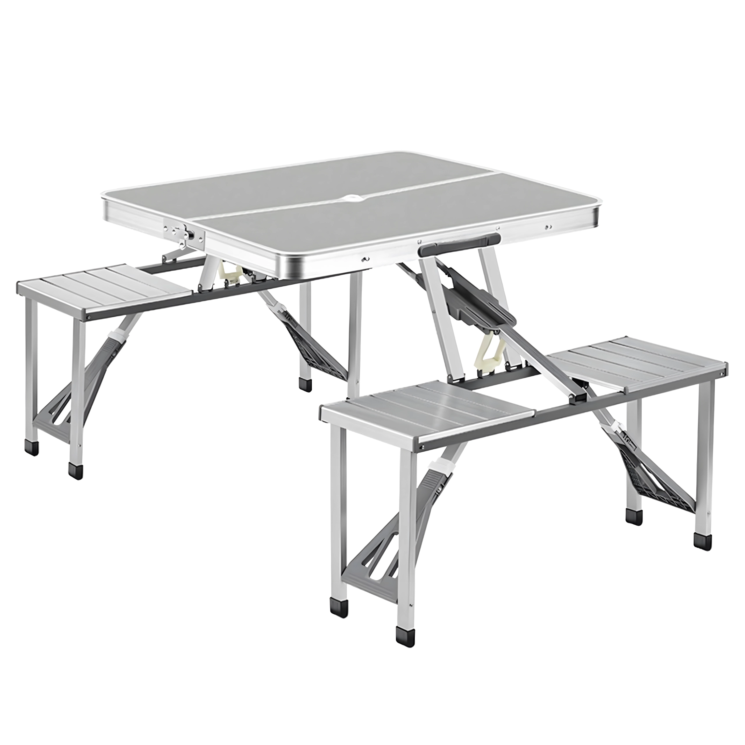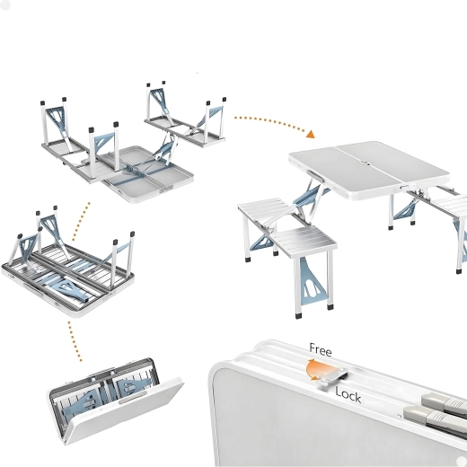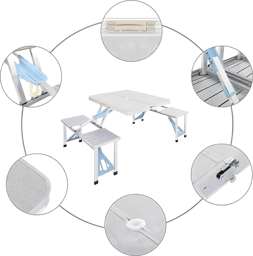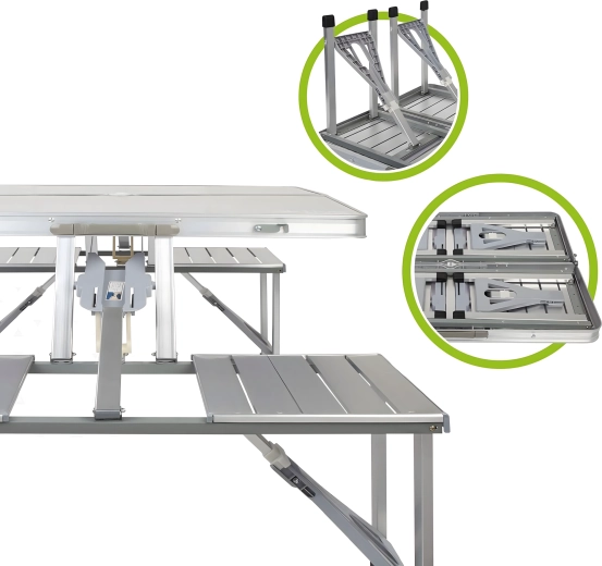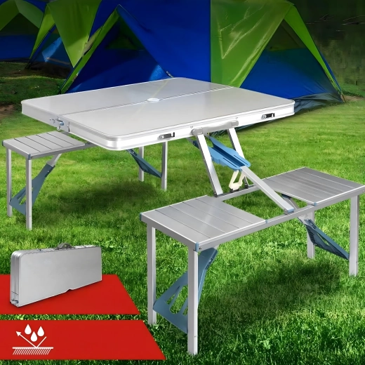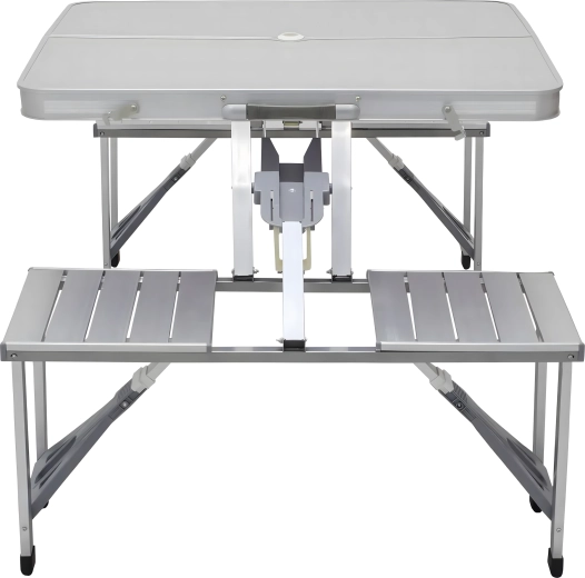 Praktikus és könnyű összecsukható kempingasztal 4 integrált ülőkével, ideális piknikhez, kempingezéshez, strandra és kertbe. A tartós alumínium és PVC kombináció hosszú élettartamot biztosít, összecsukva a teljes szett kompakt, fogantyús bőrönddé alakul. Az asztalon napernyőnyílás található, így forró napokon is kellemes árnyékot élvezhet.