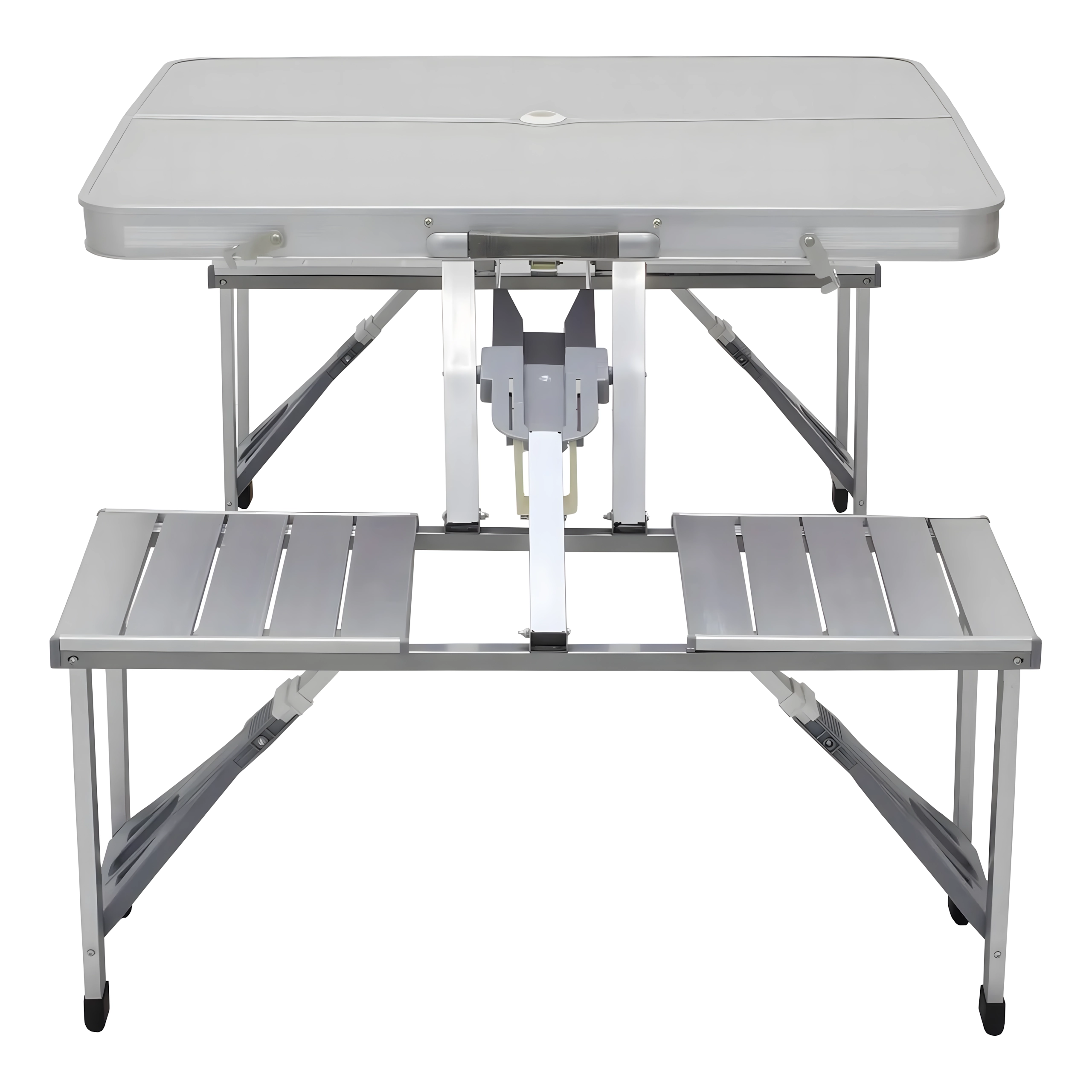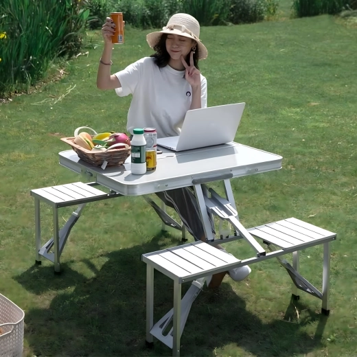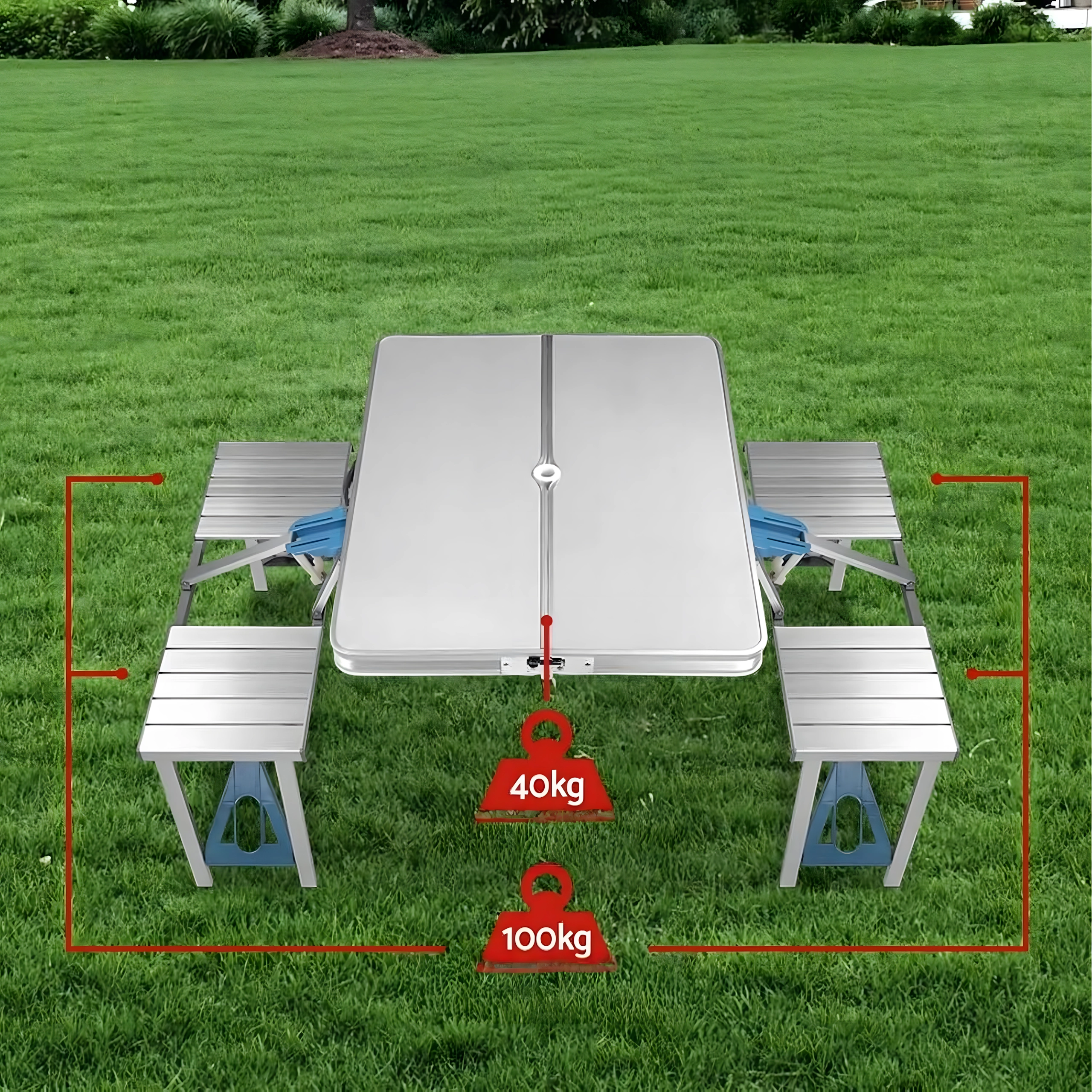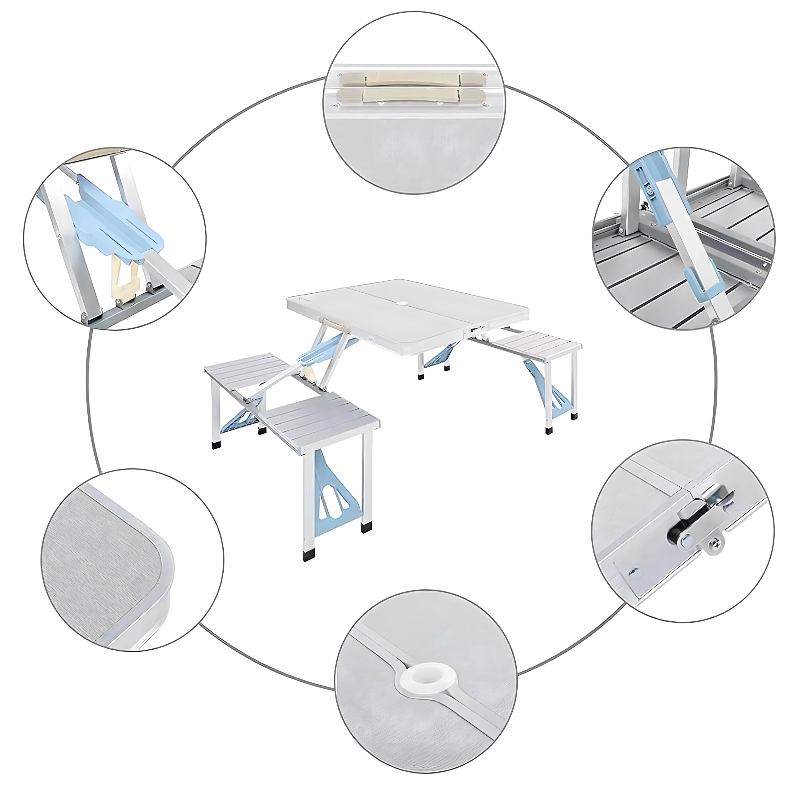 Praktikus és könnyű összecsukható kempingasztal 4 integrált ülőkével, ideális piknikhez, kempingezéshez, strandra és kertbe. A tartós alumínium és PVC kombináció hosszú élettartamot biztosít, összecsukva a teljes szett kompakt, fogantyús bőrönddé alakul. Az asztalon napernyőnyílás található, így forró napokon is kellemes árnyékot élvezhet.