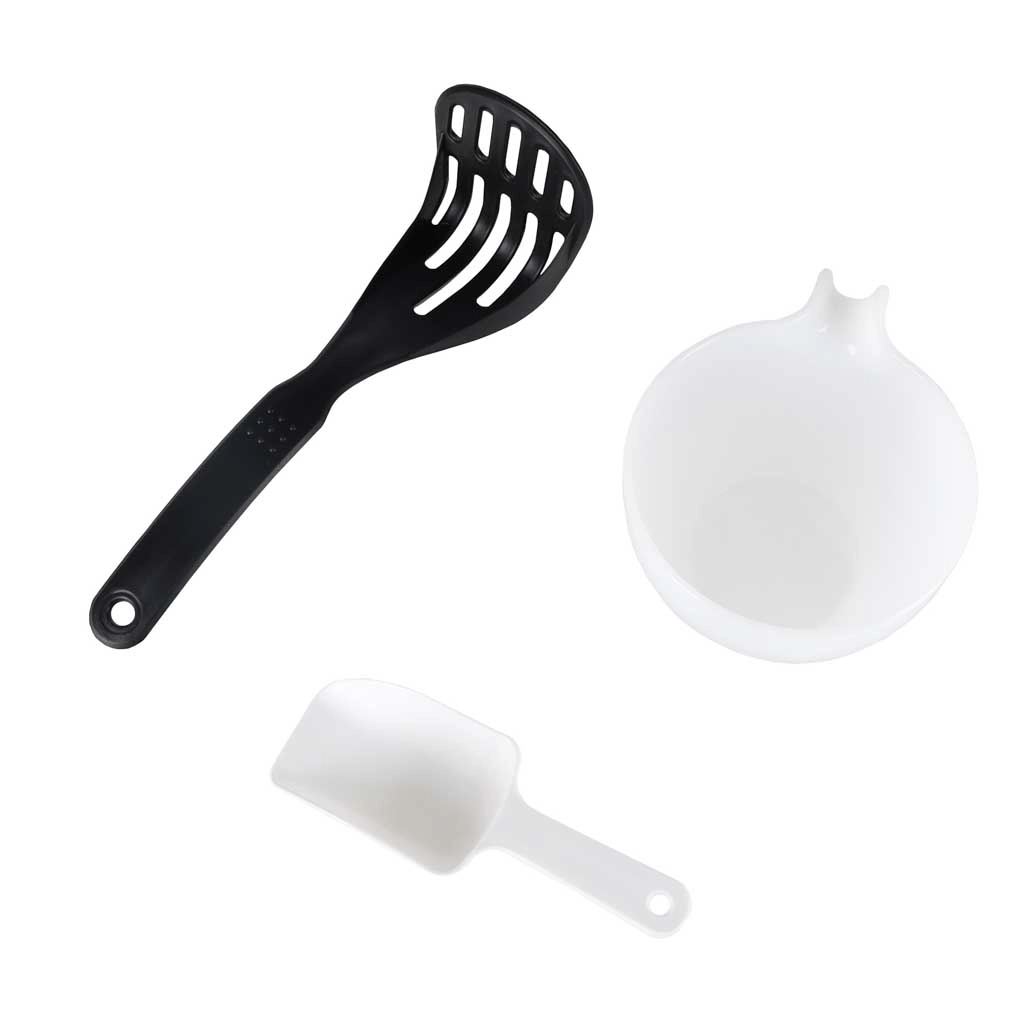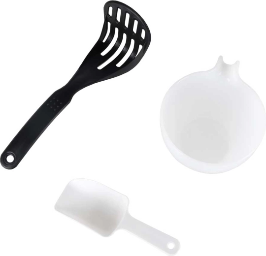 - tartály csappal és fogantyúval, fedél, csepegtető betét, mérőpohár a kivonathoz (17 × 7 cm), kanál (15 × 5,5 cm), tömörítő (22 × 7,5 cm)