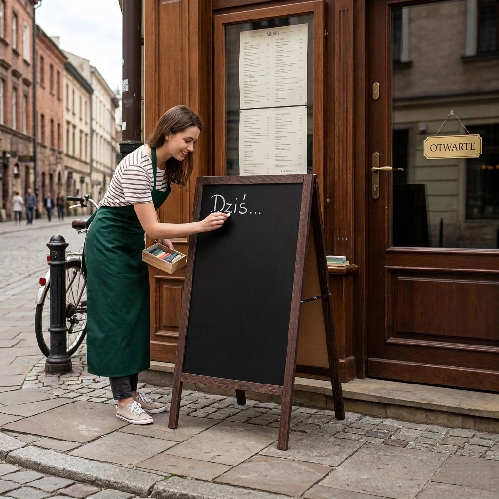 A kétoldalas reklámtábla magára vonja a járókelők figyelmét, és növeli kínálata láthatóságát. A bejárat elé, a kirakatba vagy forgalmas helyre téve azonnal tájékoztat a promóciókról, napi menüről vagy fontos közleményekről, és a betérésre ösztönöz.