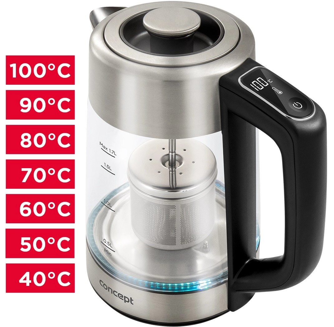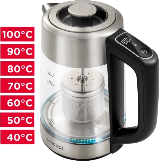 A digitális vezérlés pontos hőmérséklet-beállítást kínál 40–100 °C tartományban (egészen a forralásig). A színes LED megvilágítás első pillantásra tájékoztat a víz aktuális hőmérsékletéről. A Keep Warm funkció a kiválasztott hőmérsékleten tartja a vizet – ideális ismételt teaforráshoz, kávéhoz vagy bébiételek készítéséhez.