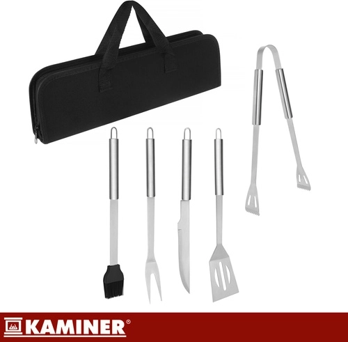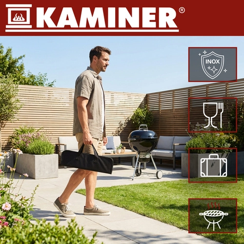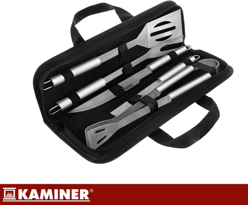 A praktikus KAMINER grillező szett mindent egy masszív tokban tart együtt, így az eszközök mindig kéznél vannak. 5 alapvető kiegészítőt tartalmaz rozsdamentes acélból hosszú nyelekkel a biztonságosabb munkához a hő közelében, minden darabon akasztófül található. A rendezett tok rugalmas rögzítőpántokkal a gyors és áttekinthető szállítást és tárolást biztosítja.