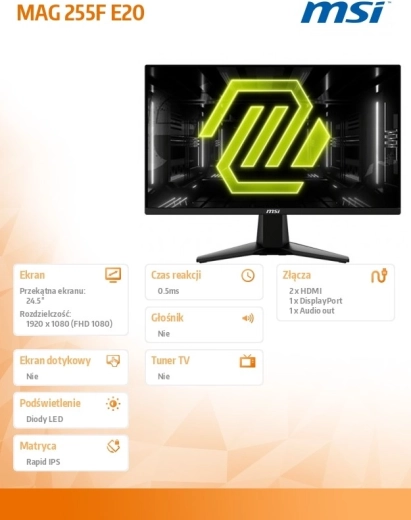 A MAG 255F E20 monitor tökéletesen ötvözi a sebességet és a kép tisztaságát a játékosok és az igényes felhasználók számára. A Full HD (1920 × 1080) felbontás 24,5" képátlón részletgazdag megjelenítést biztosít, míg a 200 Hz-es frissítési frekvencia minimálisra csökkenti az elmosódást és a szakadozást gyors mozgás közben.
