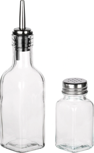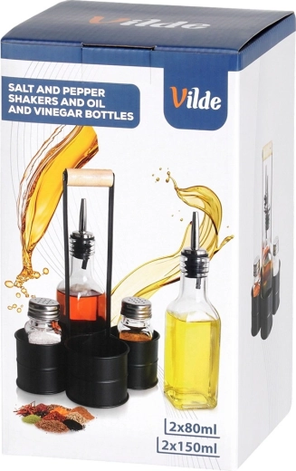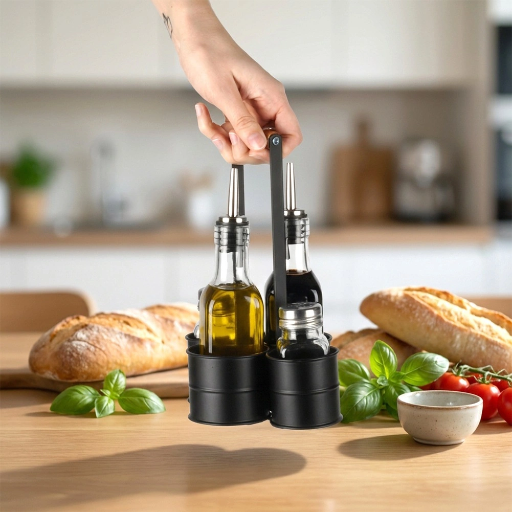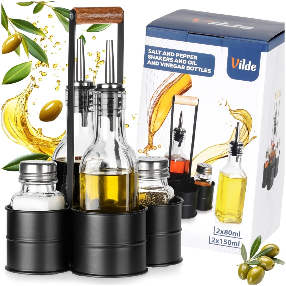 Ez a dizájn szett ötvözi a funkcionalitást és az esztétikát: két 150 ml-es palack (4,5 × 4,5 × 20 cm) olajhoz és ecethez rozsdamentes kiöntőkkel a sima, tiszta tálaláshoz, kiegészítve egy 80 ml-es só- és borsszóróval (4 × 4 × 9,5 cm). Minden egy masszív fém állványon (16,5 × 13,5 × 23 cm) kap helyet, fa fogantyúval a könnyű hordozhatóságért.