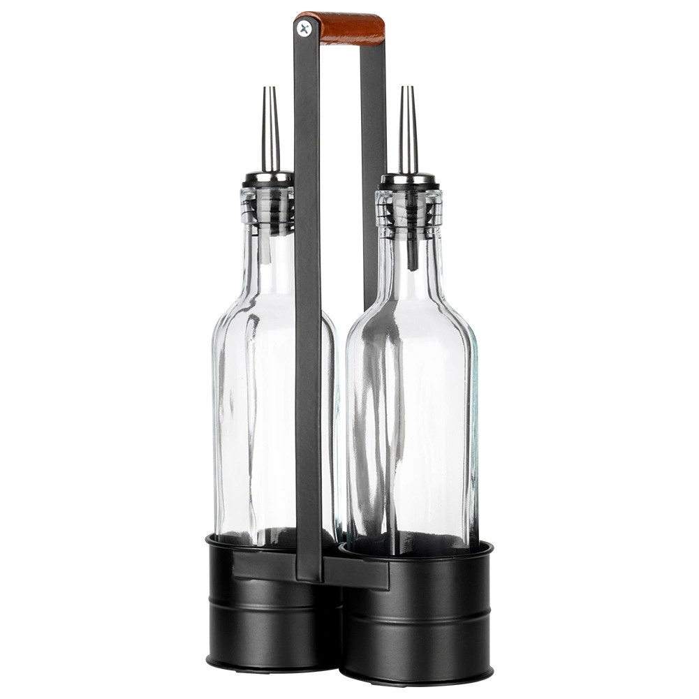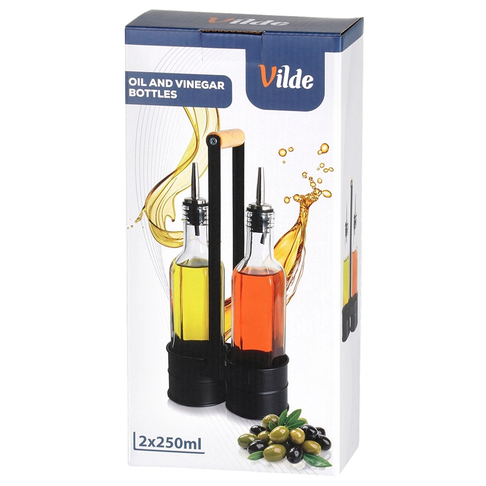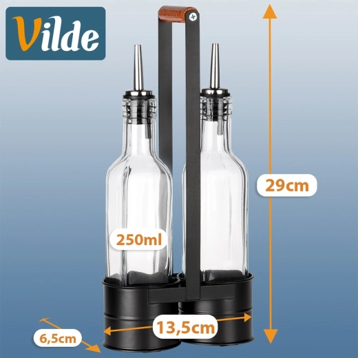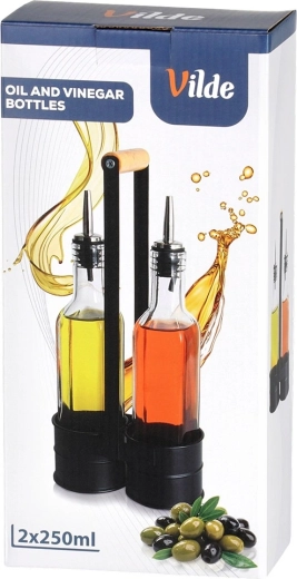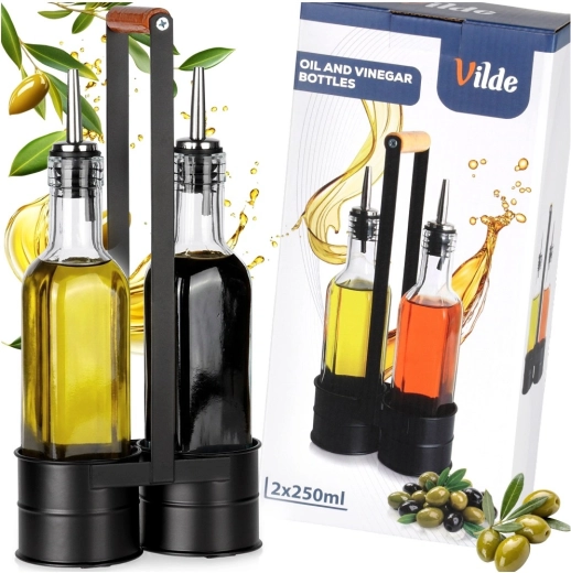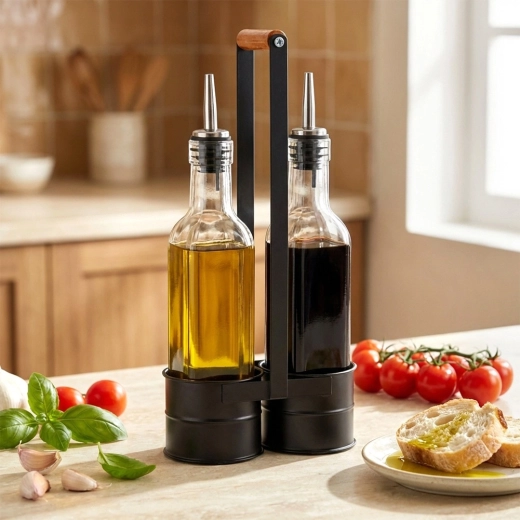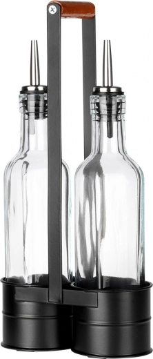 Ez a praktikus készlet két átlátszó, 250 ml-es üvegpalackot tartalmaz, masszív fém állványban, magas fogantyúval a könnyű hordozhatóságért. A rozsdamentes kiöntőnyak lassítja az átfolyást a kontrollált, cseppmentes öntéshez olaj vagy ecet esetén. A minőségi üveg és a fekete fém kombinációja modern, dekoratív megjelenést ad konyhájának.