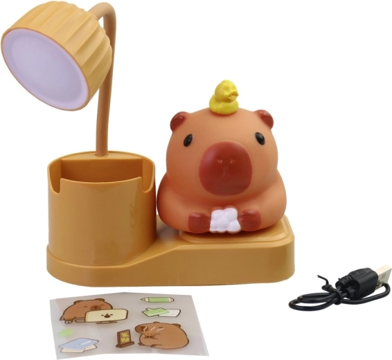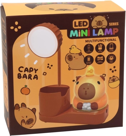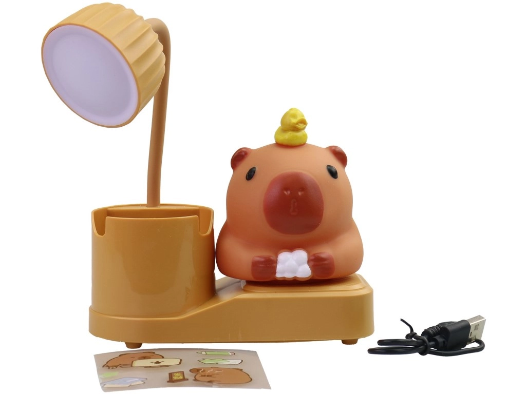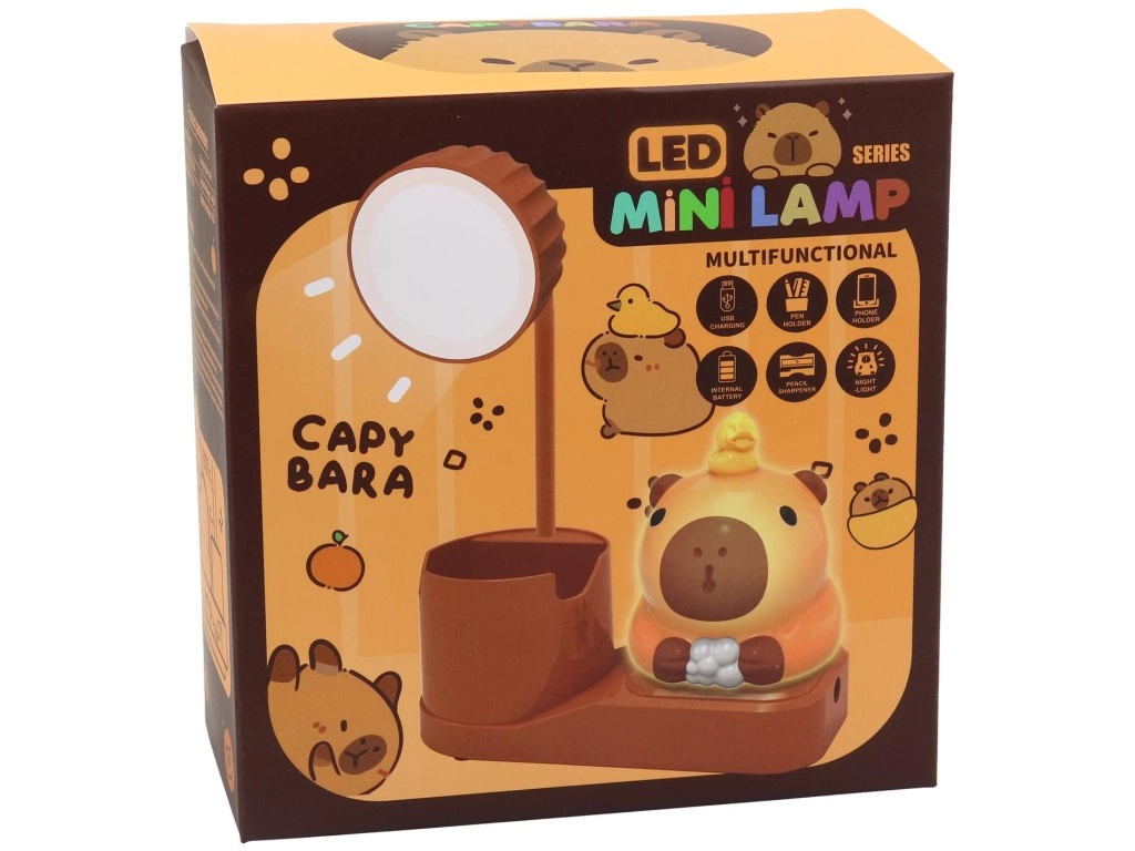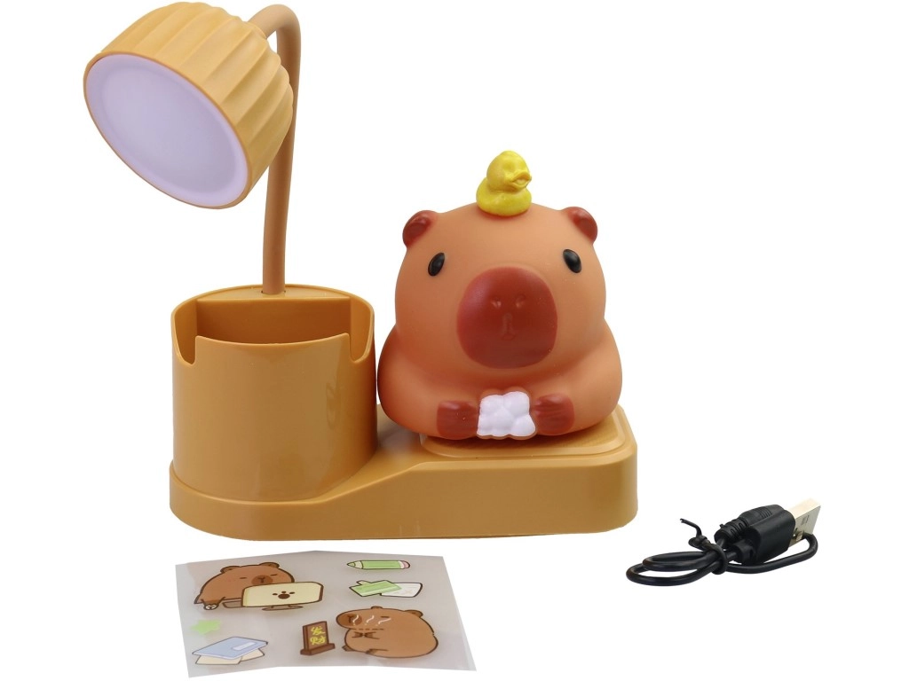 Tedd otthonossá az íróasztalt vagy a gyerekszobát ezzel a bájos kapibara motívumú lámpával és beépített írószertartóval. A kompakt méretek (magasság 14 cm, szélesség 6,5 cm) helyet takarítanak meg, a USB tápellátás könnyű használatot biztosít, a finom LED fény pedig ideális éjjeli fénynek és dekorációs elemnek is. 3 éves kortól ajánlott.