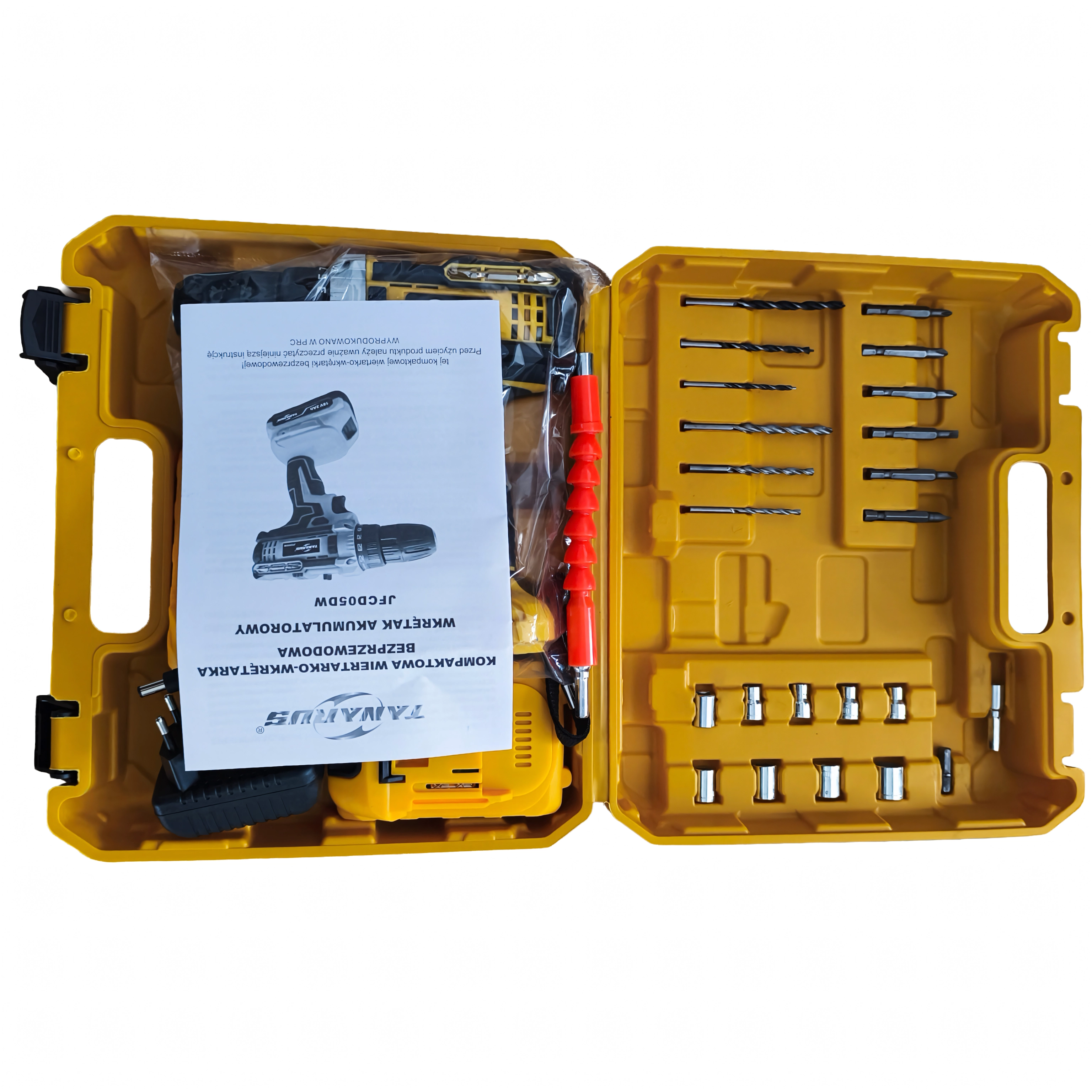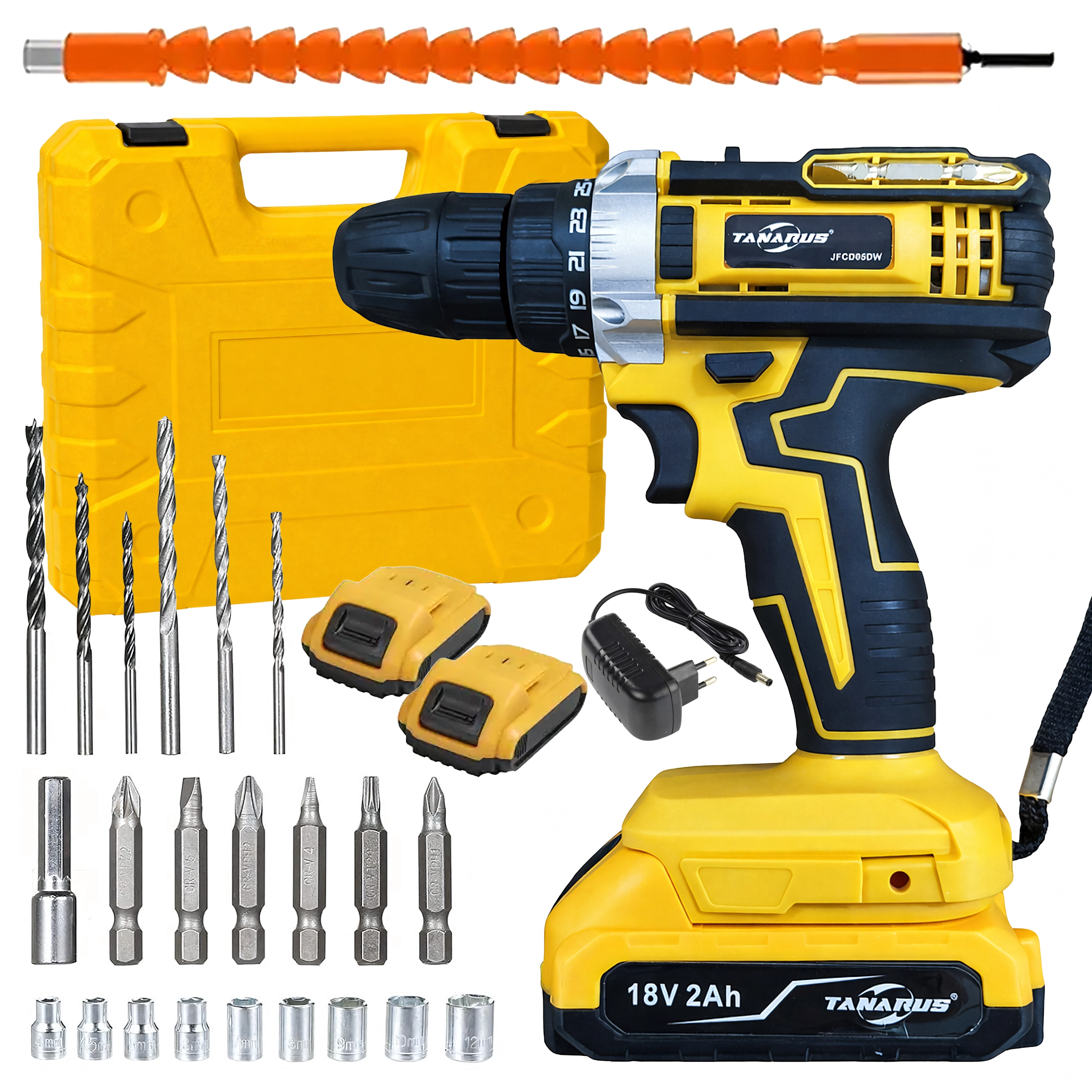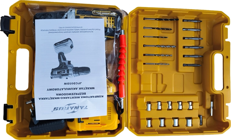 A csomag része a masszív szállítókoffer és a széles körű tartozékkészlet – fúrószárak, bitek, fejek és flexibilis hosszabbító szűk helyeken végzett munkához. A két akkumulátor lehetővé teszi a folyamatos váltást és kevesebb megszakítást. A csúszásmentes felületű ergonomikus markolat és az alacsony tömeg kényelmet nyújt hosszabb munkavégzés során.