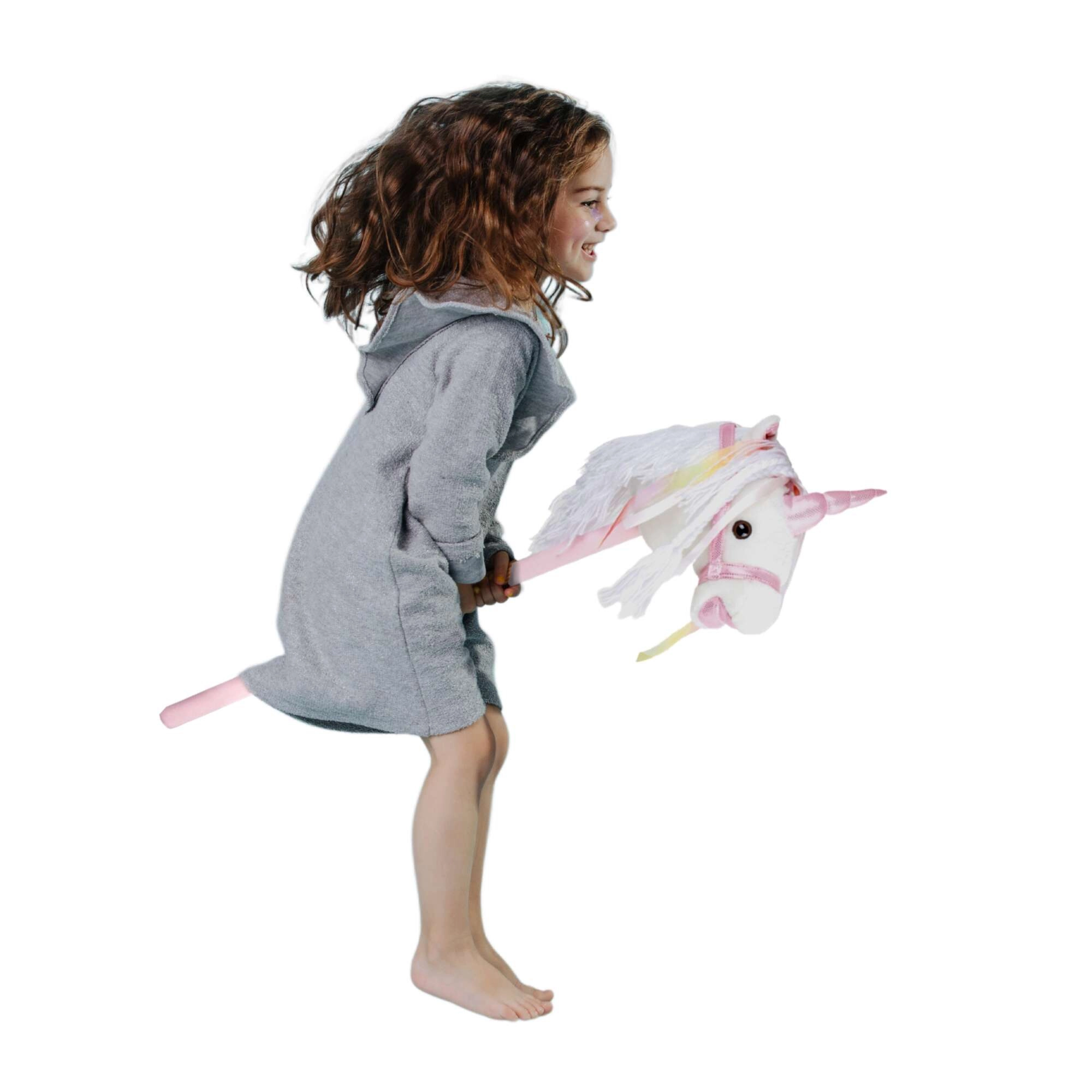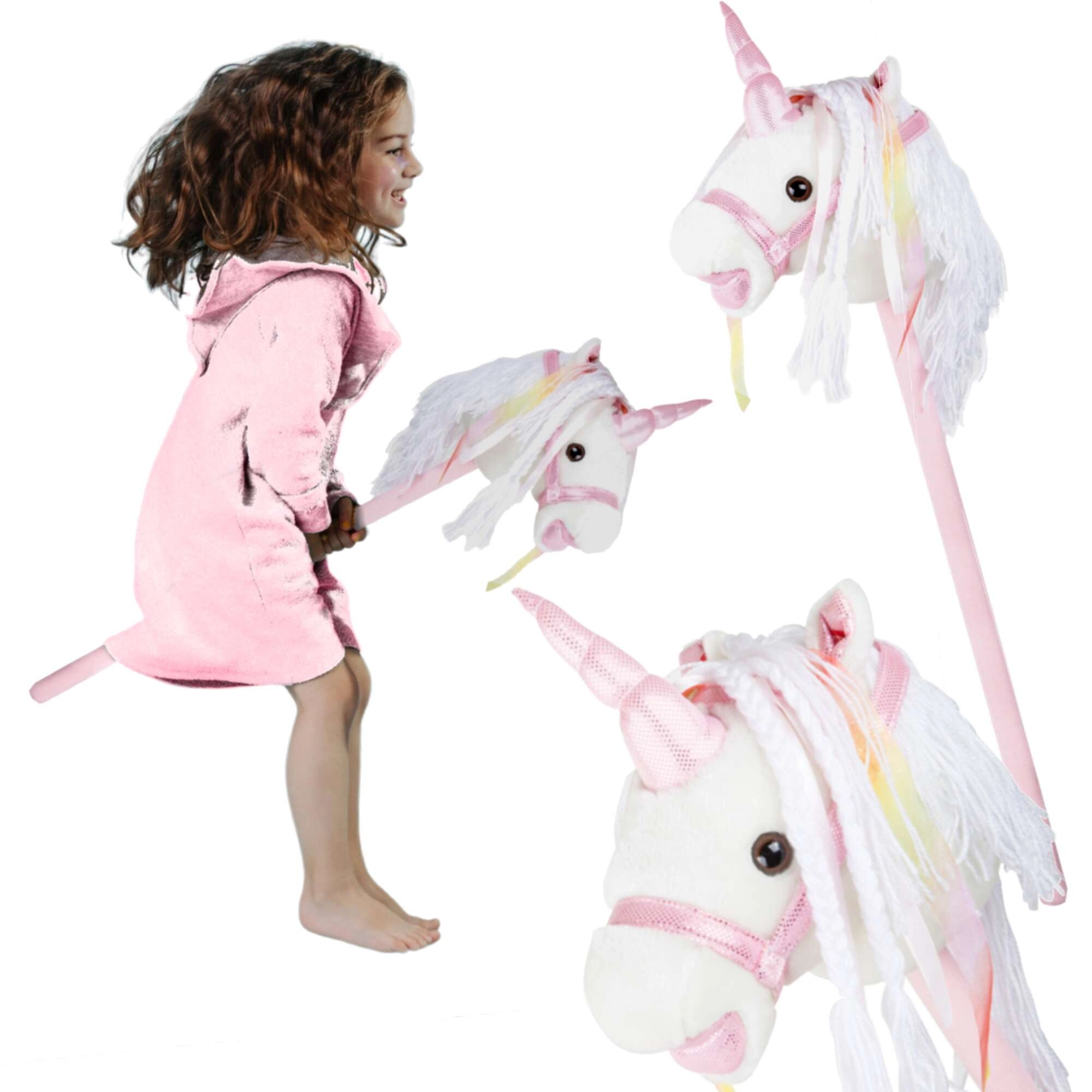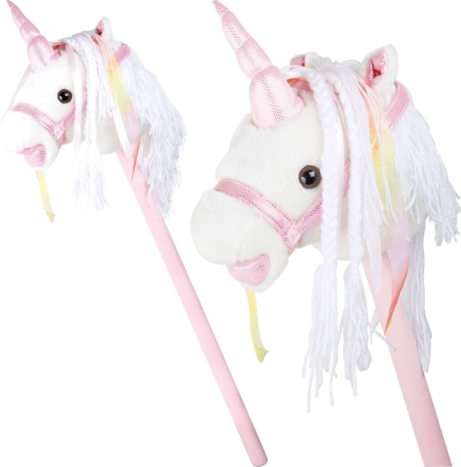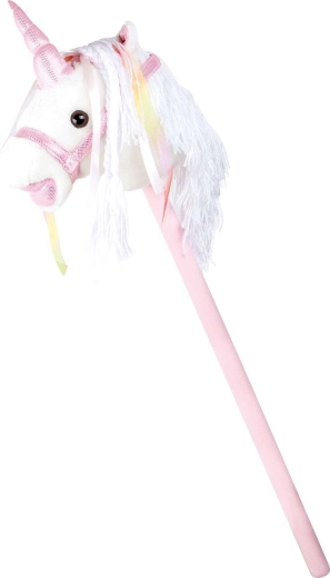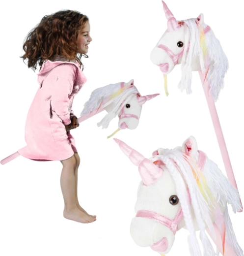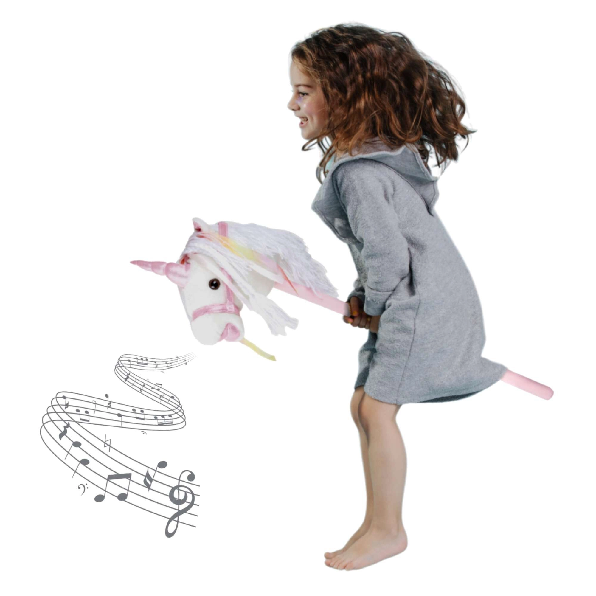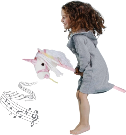 Ez a rúdlovas unikornis támogatja a mozgást, a fantáziát és a szerepjátékot. A puha plüss kellemes tapintású, a díszes sörény és szalagok pedig varázslatos hangulatot kölcsönöznek minden lovaglásnak. A fülben lévő gomb megnyomására élethű vágtázás- és nyerítés-hangok hallhatók, amelyek még valóságosabbá teszik a lovas játékot.