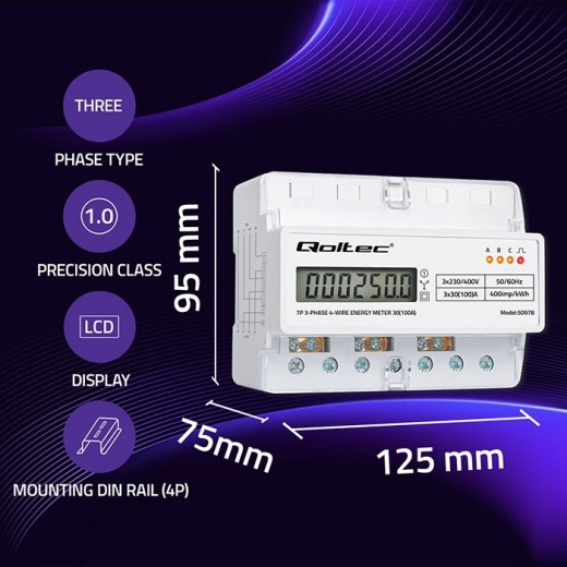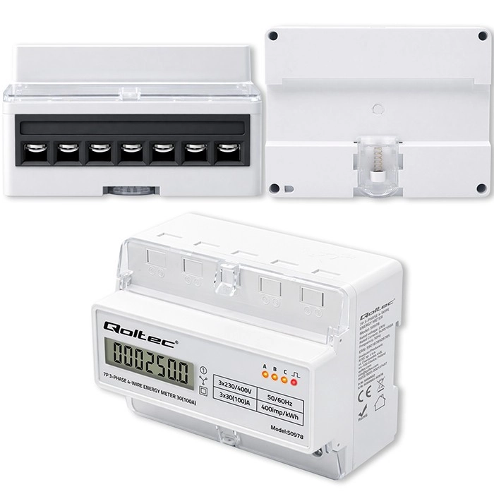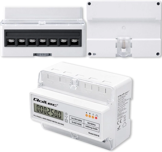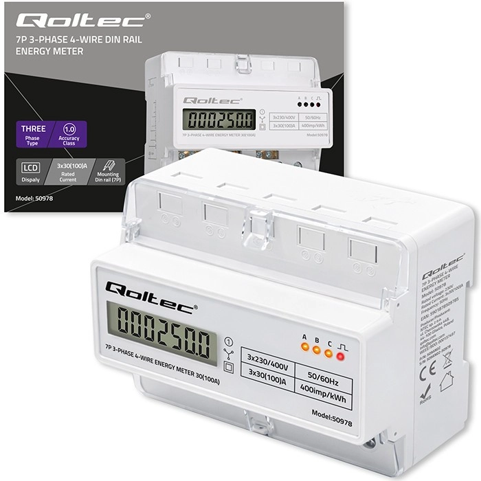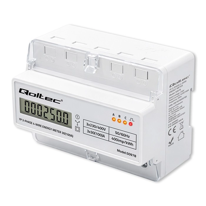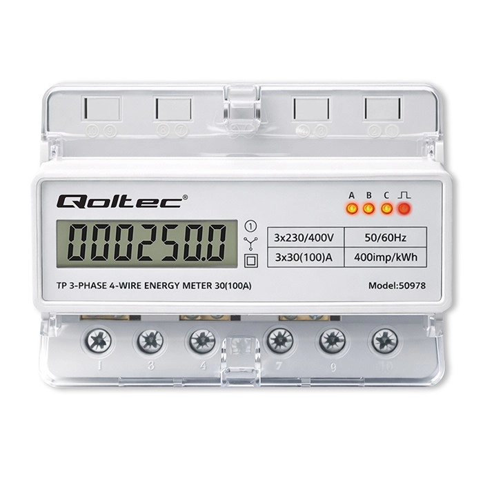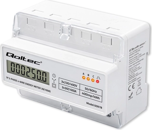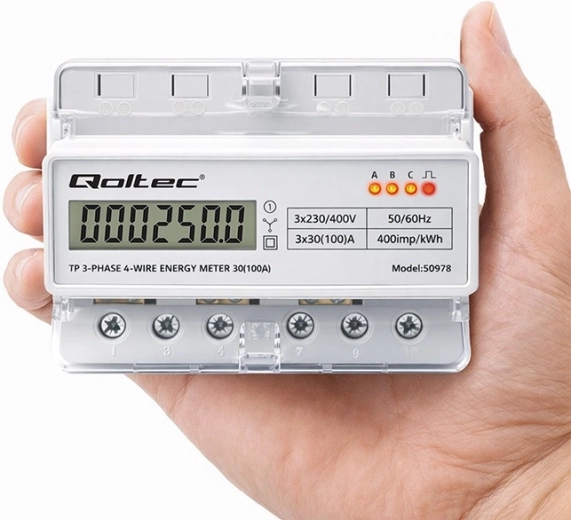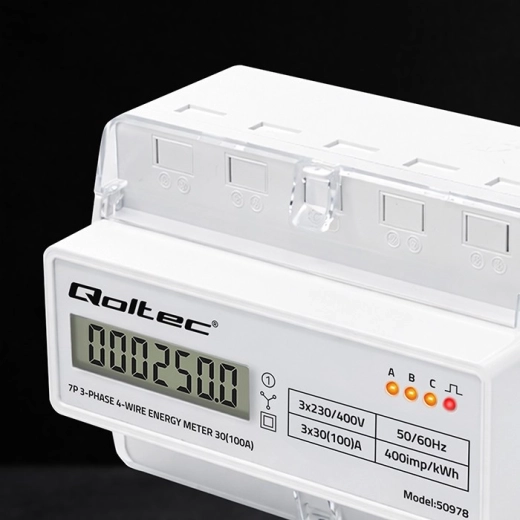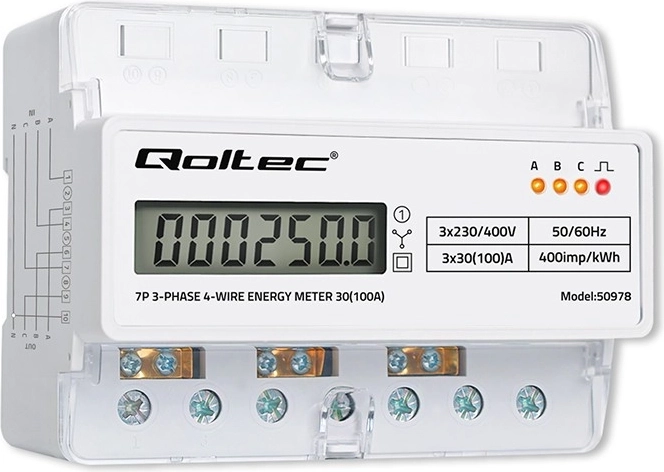 A Qoltec villanyóra megbízható mérést biztosít háromfázisú, négyszeres vezetésű installációkhoz 50/60 Hz frekvencián. A 6+1 LCD kijelzőn könnyen leolvashatók az értékek kWh-ban, míg a LED dióda 400 imp/kWh állandóval jelzi a fogyasztást. A kompakt kialakítás és a TH35 DIN sínre szerelés egyszerűsíti a telepítést és a szervizt.