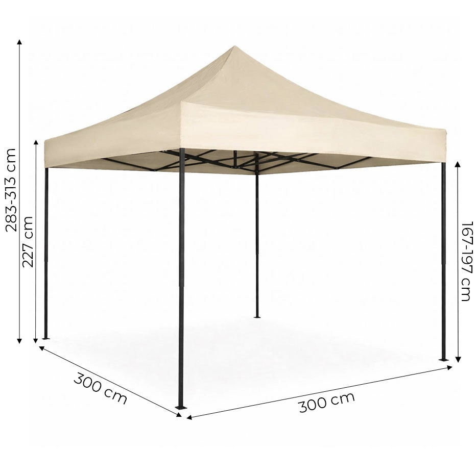 Praktikus kerti pavilon 3×3 m méretben, amellyel pillanatok alatt árnyékot és menedéket hozhat létre grillezéshez, ünnepségekhez vagy céges rendezvényekhez. A automatikusan kihajtható acélváznak köszönhetően egy szempillantás alatt felállítható. A 4 fokozatú magasságállítás az igényeihez igazítja a teret, a 420D tető PVC bevonattal pedig véd a naptól és az enyhe esőtől. A csomag tartalmaz szállítótáskát, cövekeket és rögzítőköteleket a jobb stabilitás érdekében.
