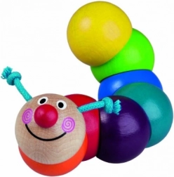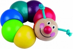 Színes, fa gyöngyökből rugalmas gumira fűzött hernyó, amely támogatja a finommotorika fejlesztését már 6 hónapos kortól. Egészségre ártalmatlan, megfelel az EU-s szabványoknak, és a 13 cm-es, kompakt hossznak köszönhetően a kis kezekben is remekül tartható.