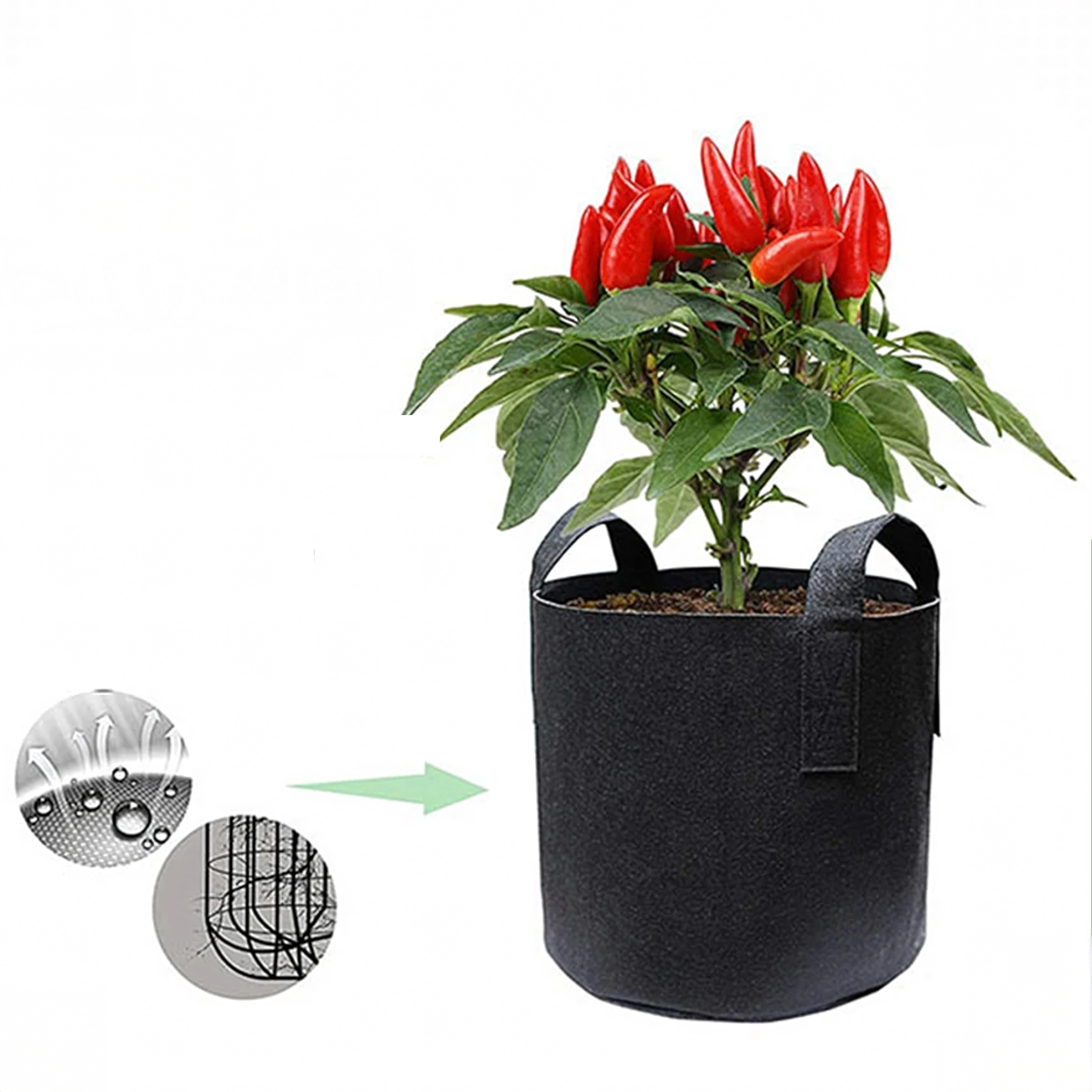 A textil termesztőzsák remek választás mindenkinek, aki hatékonyan szeretné kihasználni a teret, és egészséges növényeket szeretne nevelni hagyományos ágyások nélkül is. A lélegző anyagnak köszönhetően a gyökerek elegendő oxigénhez jutnak, ami gyorsabb növekedést és erősebb gyökérrendszert eredményez. A zsák az erős füleknek köszönhetően könnyen áthelyezhető, és a teljes szezonban többször is használható.