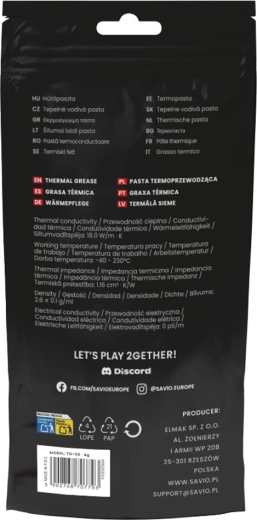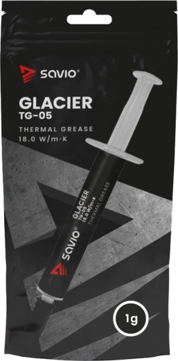 A SAVIO GLACIER TG-05 nagy teljesítményű hővezető paszta játékosoknak, alkotóknak és overclockereknek tervezve. Kiemelkedő, 18 W/m·K hővezető-képességének köszönhetően gyorsan elvezeti a hőt a CPU/GPU felől a hűtő felé, így csökkenti a hőmérsékletet, növeli az alkatrészek élettartamát és fokozza a stabilitást nagy terhelés mellett.