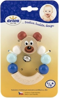 A bájos, kék színű mackóval díszített fa csörgő minden 6 hónapos kortól ajánlott babát megörvendeztet. A beépített csengő finoman csilingel, a játék könnyű súlyú, és jól illeszkedik a kis kezekbe. Megfelel az EU szigorú biztonsági előírásainak, és rendelkezik a Biztonságos játék tanúsítvánnyal.