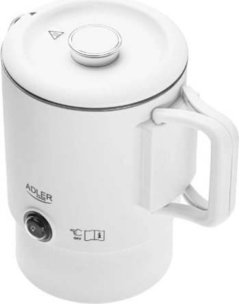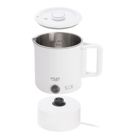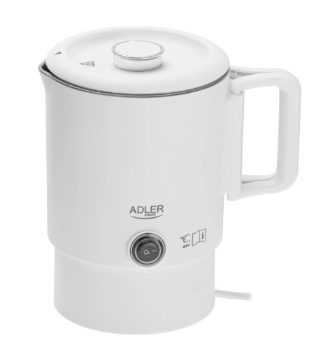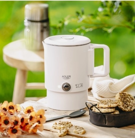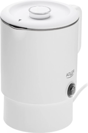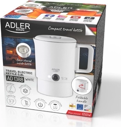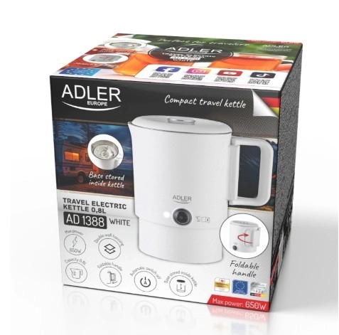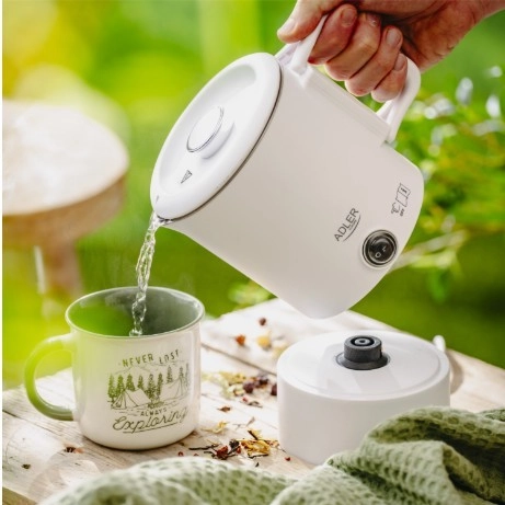 Az ADLER AD 1388 utazó vízforraló 0,8 l űrtartalommal bárhol elkészíti a teát, kávét vagy az instant ételeket. A dupla falú kialakítás SUS304 rozsdamentes belsővel és tartós polipropilén külsővel jól tartja a hőt és növeli a használat biztonságát.