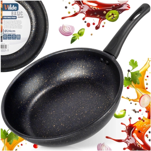 Praktikus, 24 cm átmérőjű gránit serpenyő a Basic Line sorozatból, amely tapadásmentes felületet kínál a minimális zsiradékkal való főzéshez, gyors és egyenletes sütést, valamint kényelmes fogást az ergonomikus nyélnek köszönhetően. Alkalmas gáz-, elektromos és üvegkerámia főzőlapokra (indukcióhoz nem megfelelő), és mosogatógépben mosható.