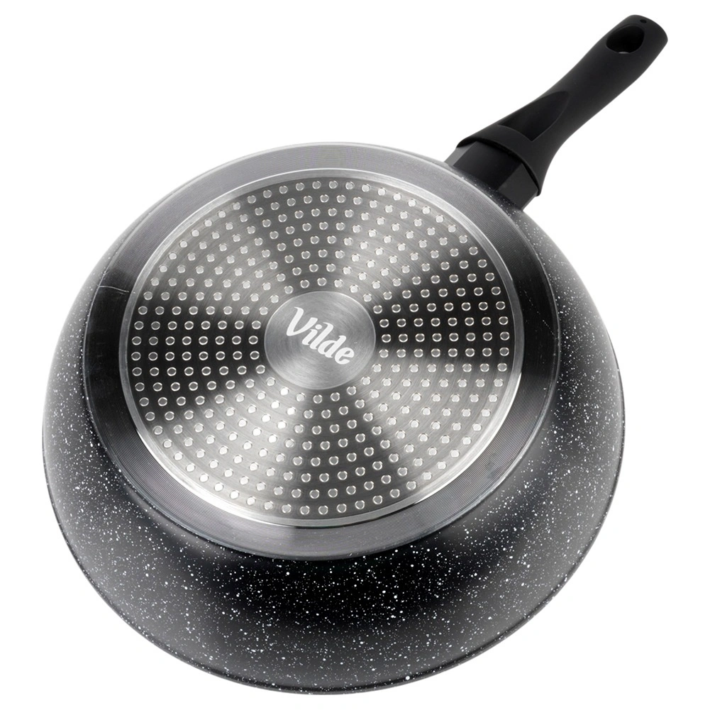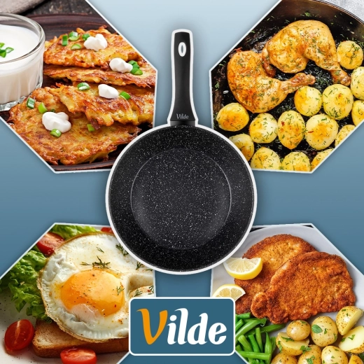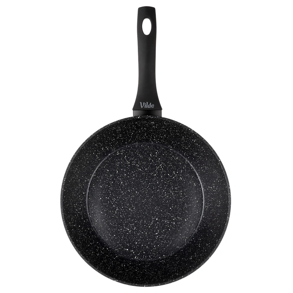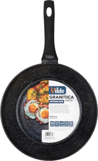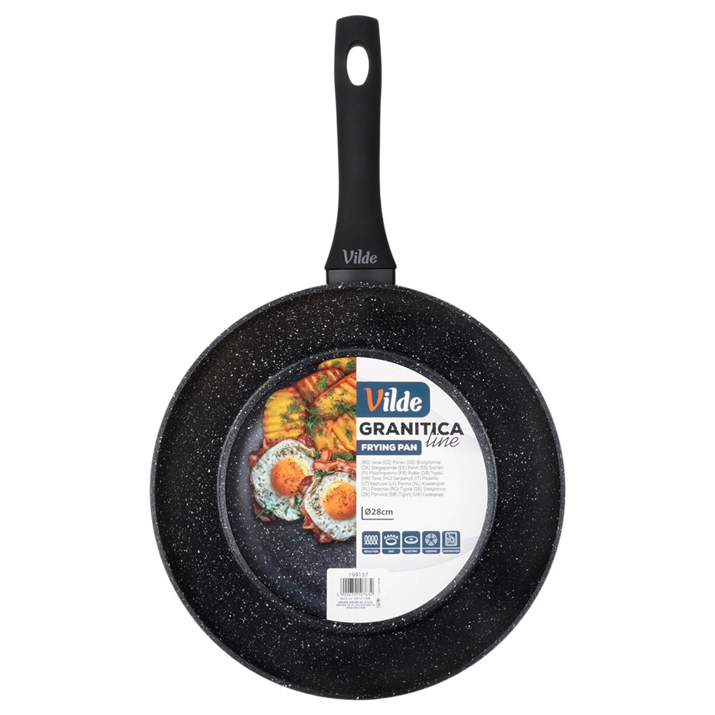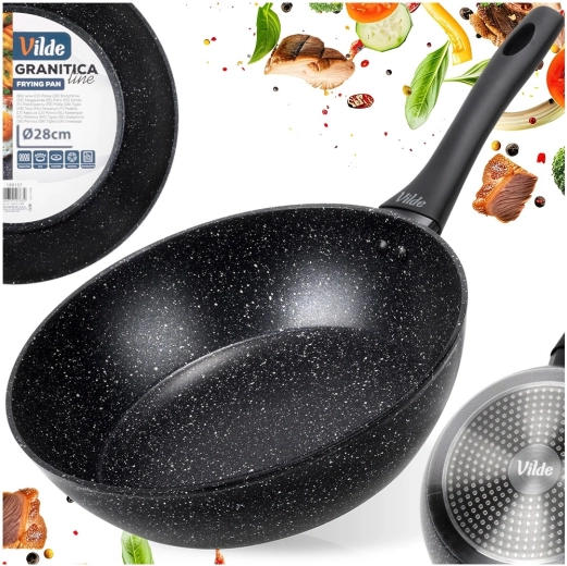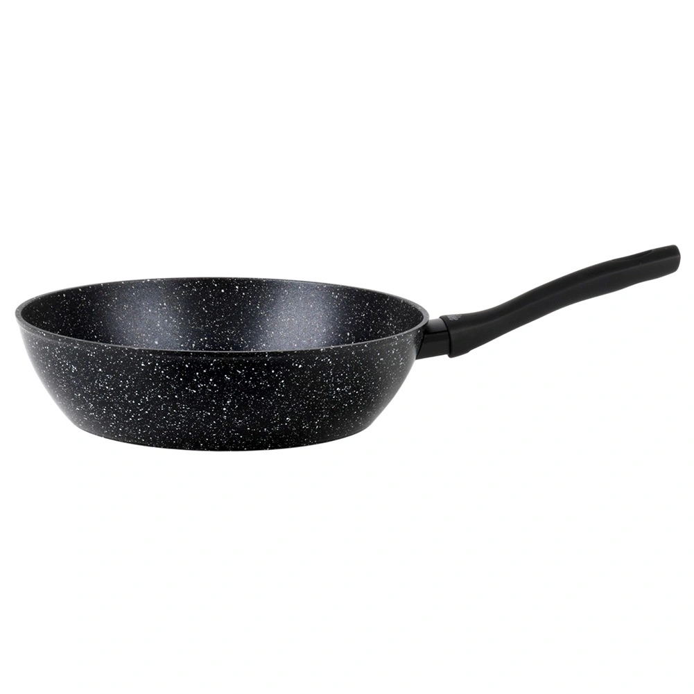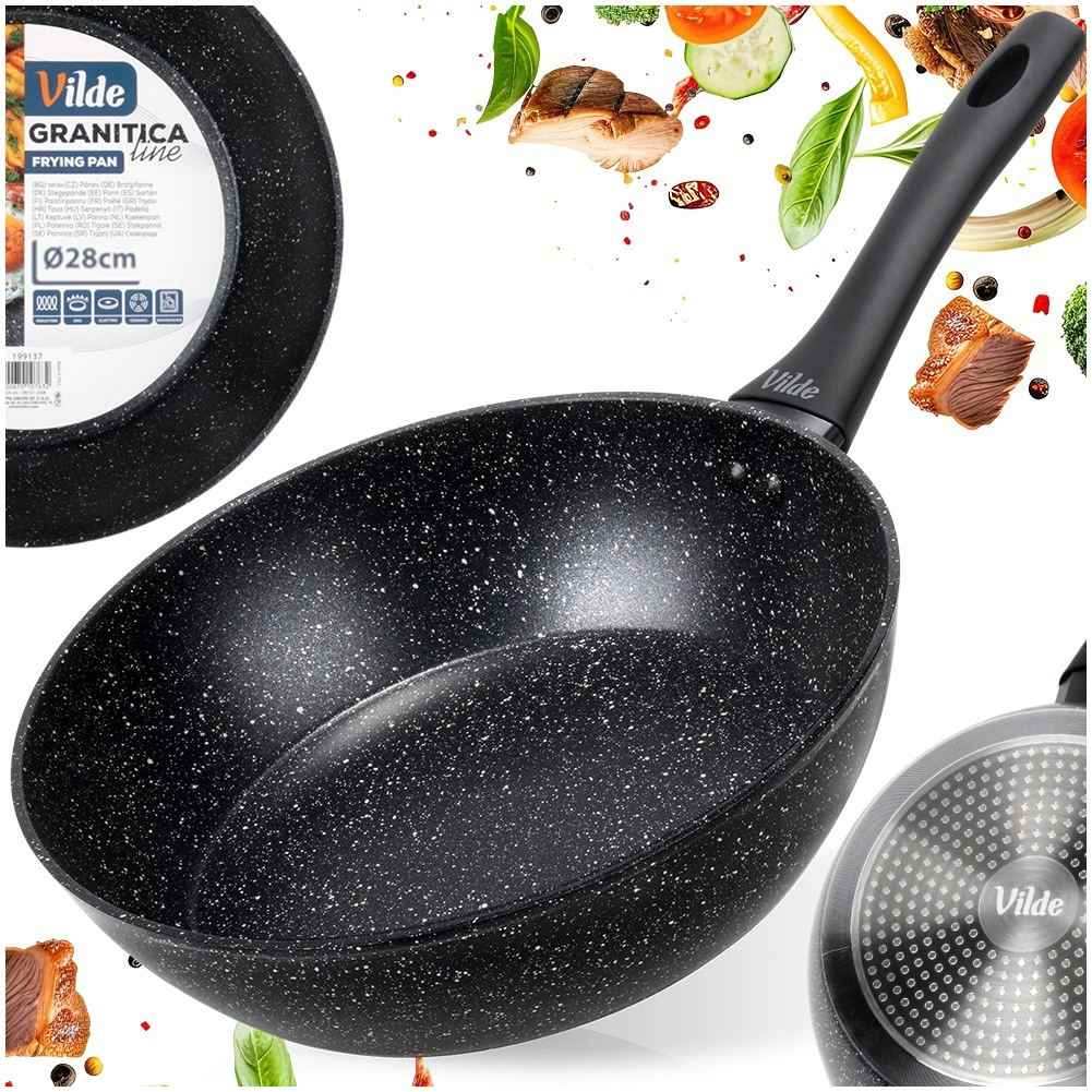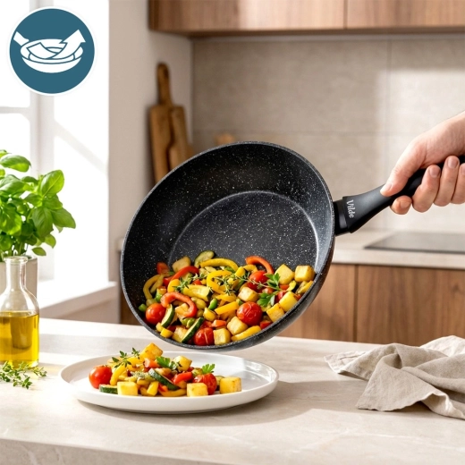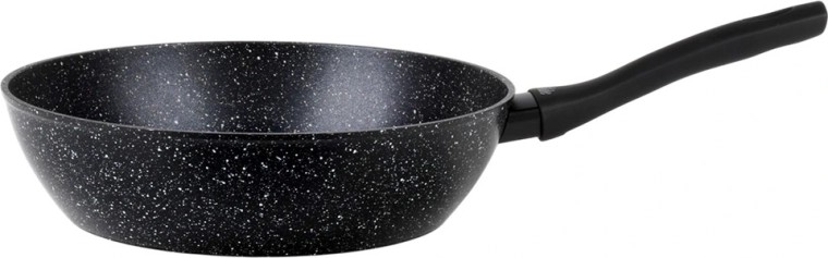 Praktikus, 28 cm átmérőjű gránit serpenyő a mindennapi főzéshez. A tapadásmentes gránit bevonatnak köszönhetően minimális zsiradékkal süthet, a masszív alumíniumtest pedig gyors és egyenletes hőeloszlást biztosít. Az ergonomikus soft touch nyél kényelmes és biztonságos, a serpenyő minden típusú tűzhelyhez, beleértve az indukciósat is, alkalmas, és mosogatógépben mosható.