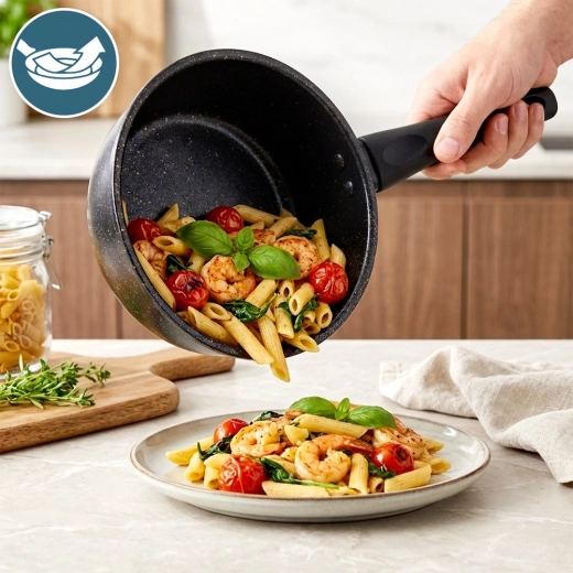 A gránit felület megakadályozza az odaégést, és lehetővé teszi a főzést minimális olajjal – az étel nem ragad le, és megőrzi kiváló ízét.
