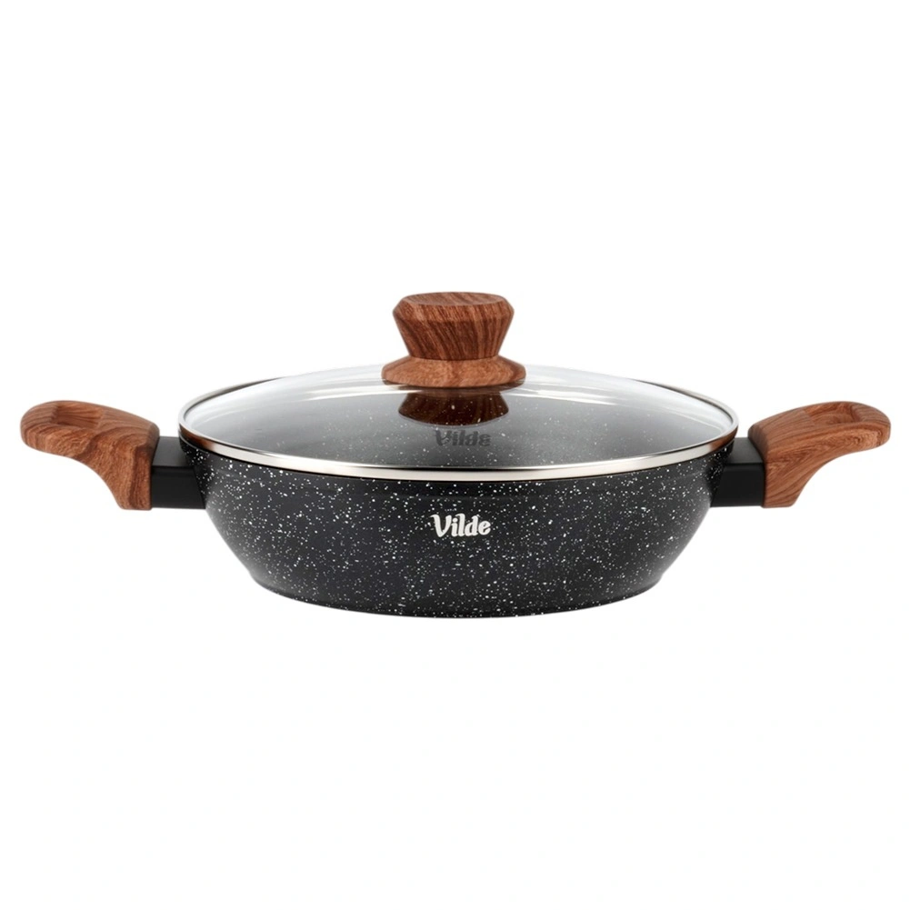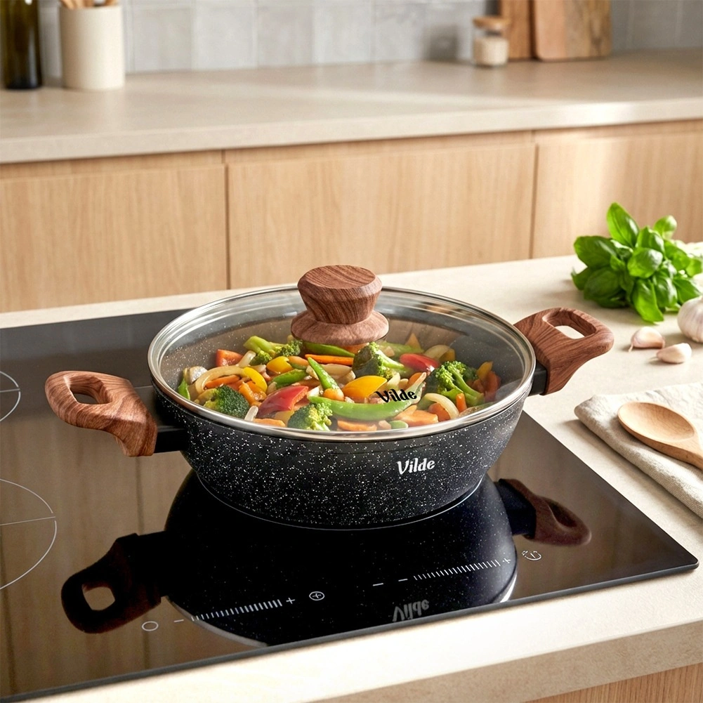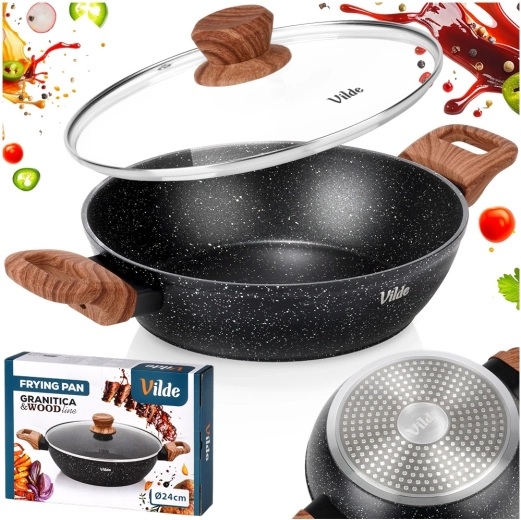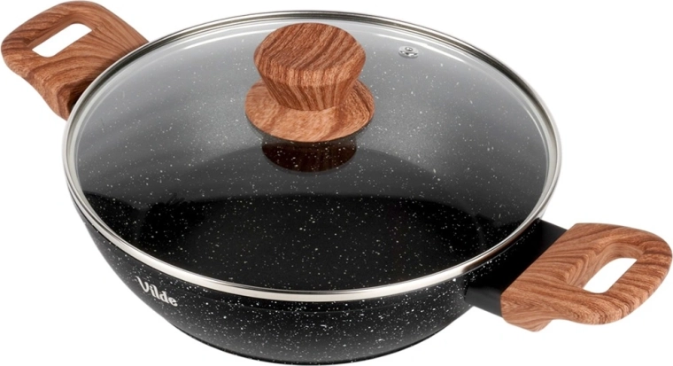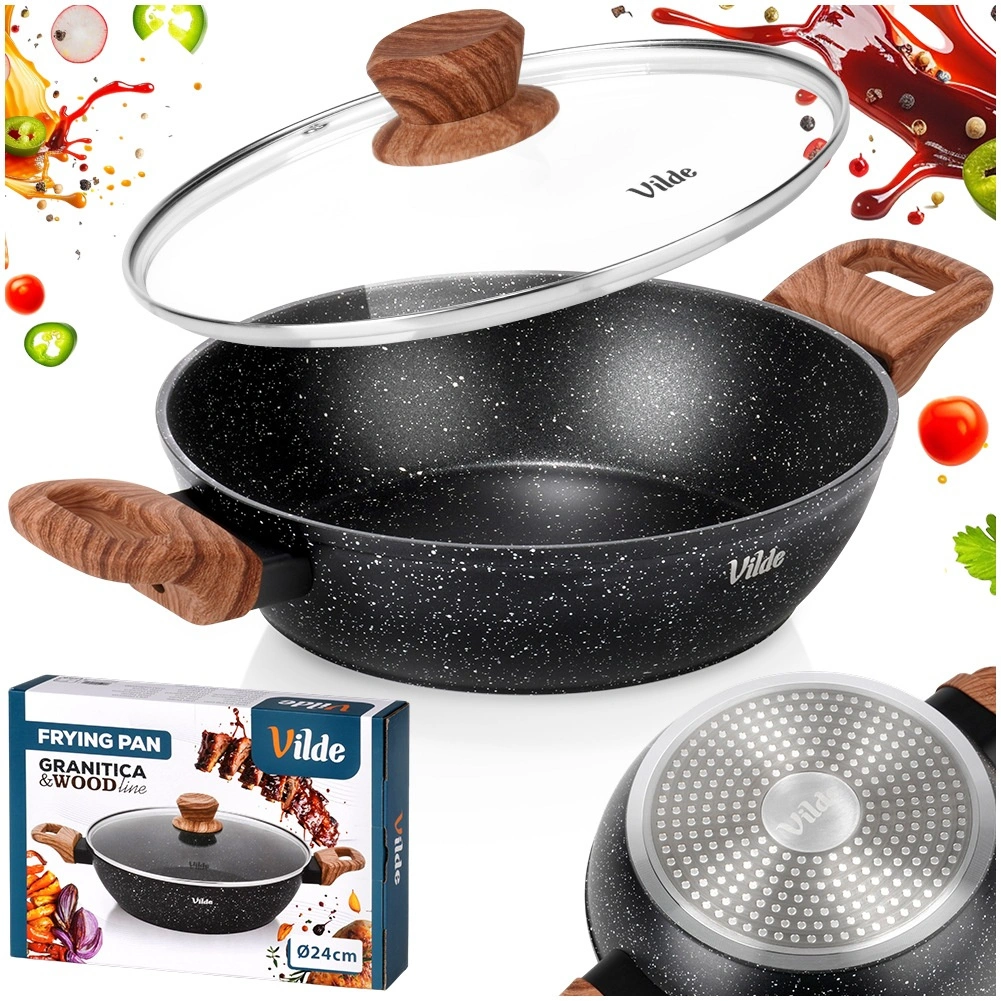Praktikus, 2,2 l űrtartalmú mély serpenyő üvegfedővel a mindennapi főzéshez. A tapadásmentes gránit bevonatnak, az egyenletes hőelosztásnak és a fa hatású, soft touch fogantyúknak köszönhetően könnyedén készíthetőek sült, párolt és rakott ételek minimális zsiradékkal. A hőálló üveg fedő gőzszeleppel kényelmes főzésellenőrzést tesz lehetővé. Alkalmas indukciós, gáz-, elektromos és kerámia főzőlapokra, és mosogatógépben is tisztítható.