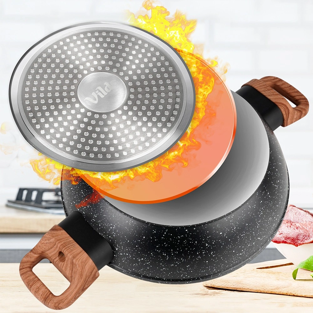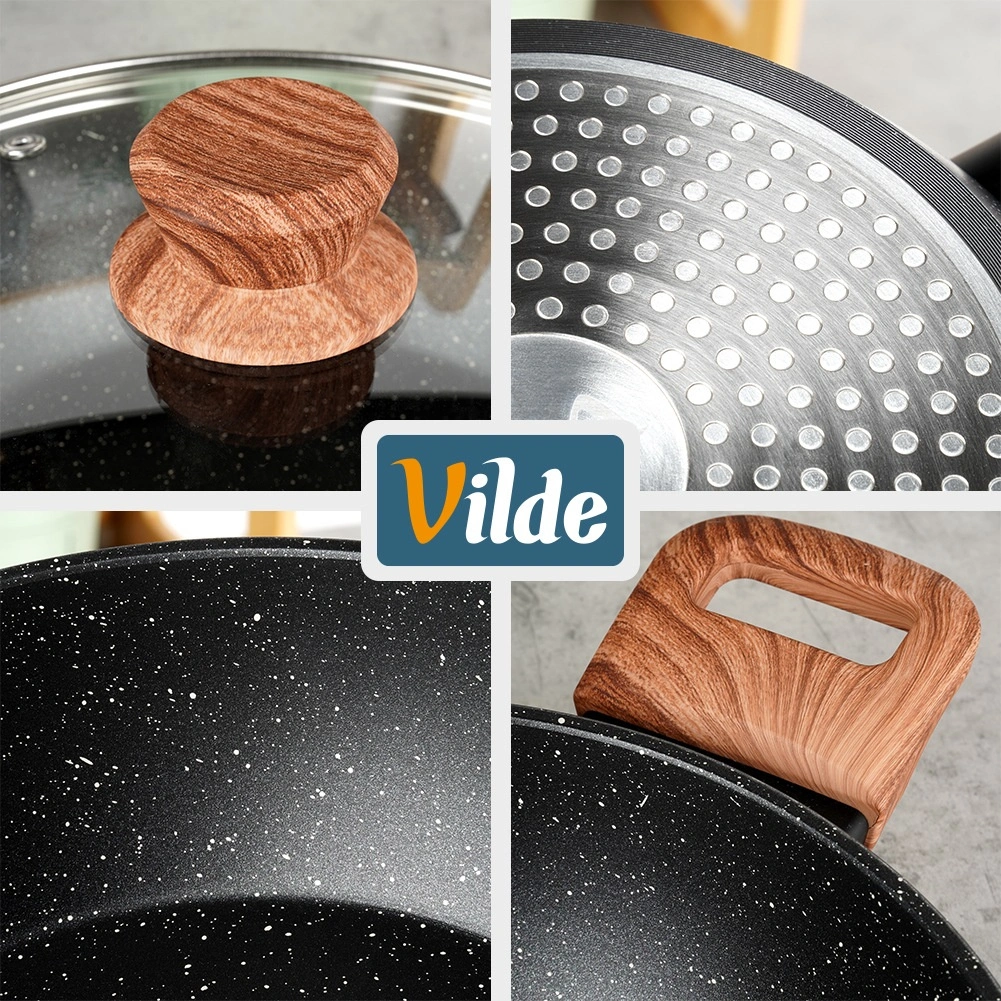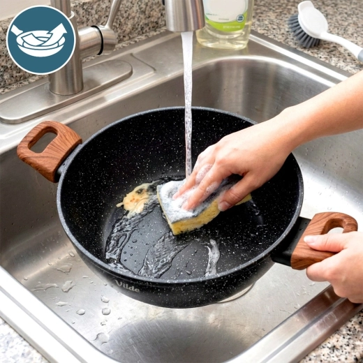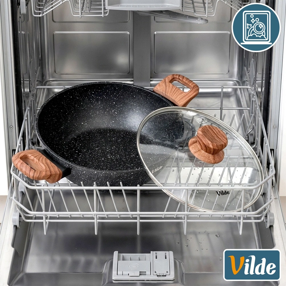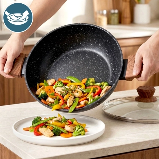 Az ergonomikus, fa hatású soft touch fogantyúk biztos és kényelmes fogást adnak a mozgatásnál. A serpenyő minden főzőlaptípussal kompatibilis, beleértve az indukciót is, és a könnyű karbantartás érdekében mosogatógépben mosható.