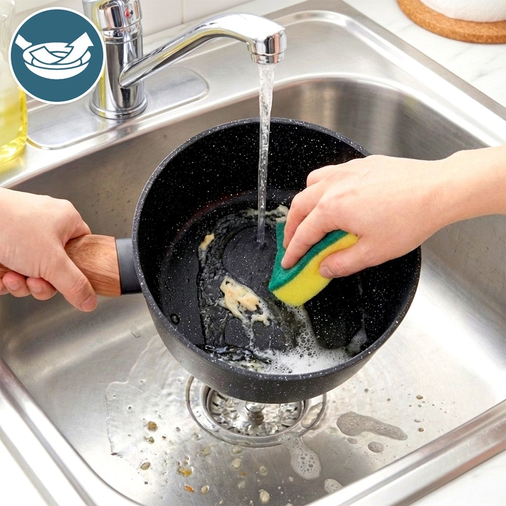 A speciális gránit réteg minimalizálja a tapadást, kevesebb zsiradékkal való főzést tesz lehetővé, és megkönnyíti a tisztítást.