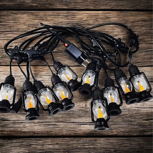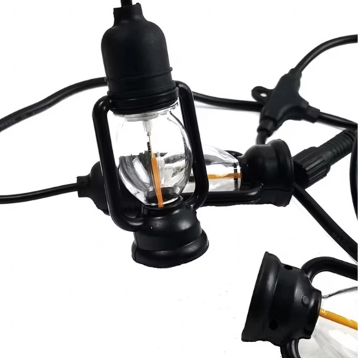 A fekete burás és áttetsző „üvegű” kivitel időtlen, vintage hatást kölcsönöz, és remekül illik természetes és indusztriális kiegészítőkhöz is. A rugalmas kábel megkönnyíti a felszerelést korlát mentén, pergolán vagy a falon.