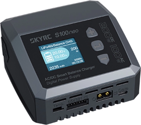 A kompakt és nagy teljesítményű SkyRC S100neo töltő RC-hez és műhelyhasználatra AC/DC tápellátást, DC-n akár 200 W teljesítményt és pontos cellakiegyenlítést kínál 1000 mA-ig. Széles akkumulátortámogatás (LiPo, LiHV, LiFe, LiIon, NiMH, NiCd, Pb), áttekinthető 1,77" színes kijelző és digitális CC/CV tápegység mód is rendelkezésre áll.