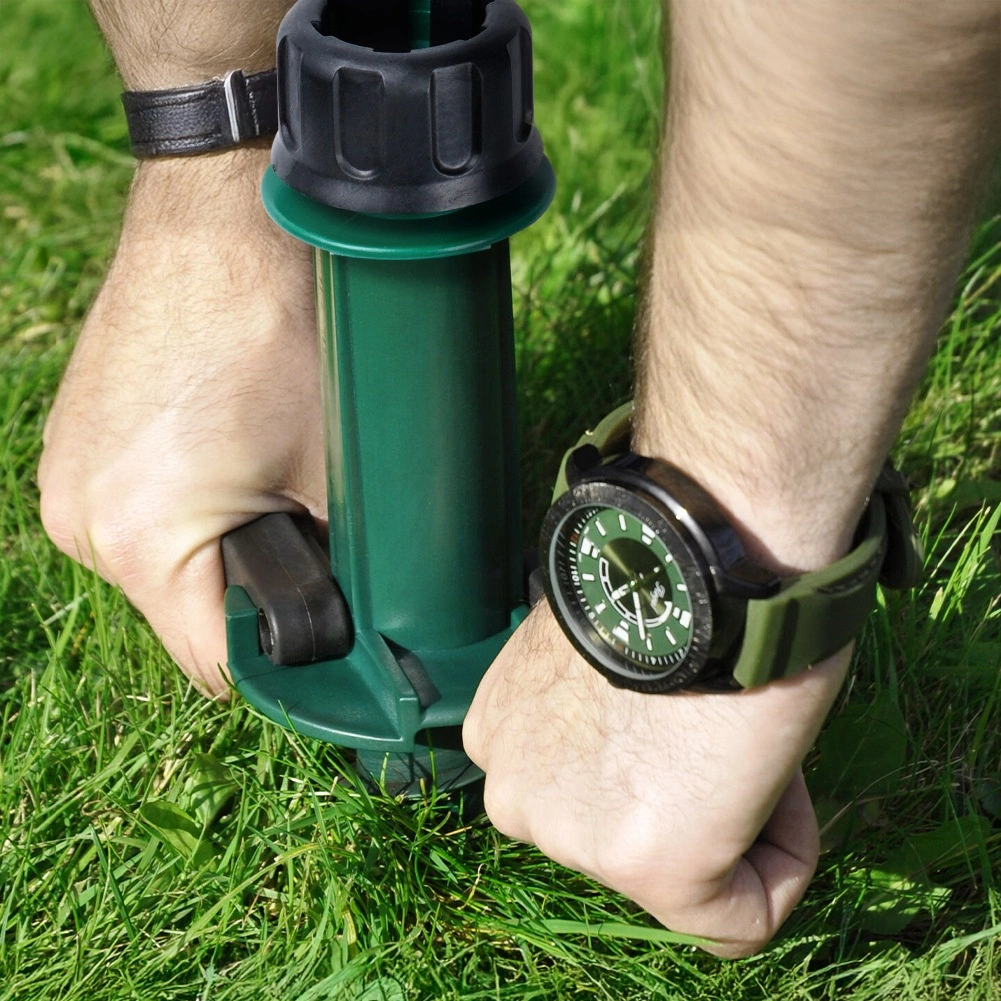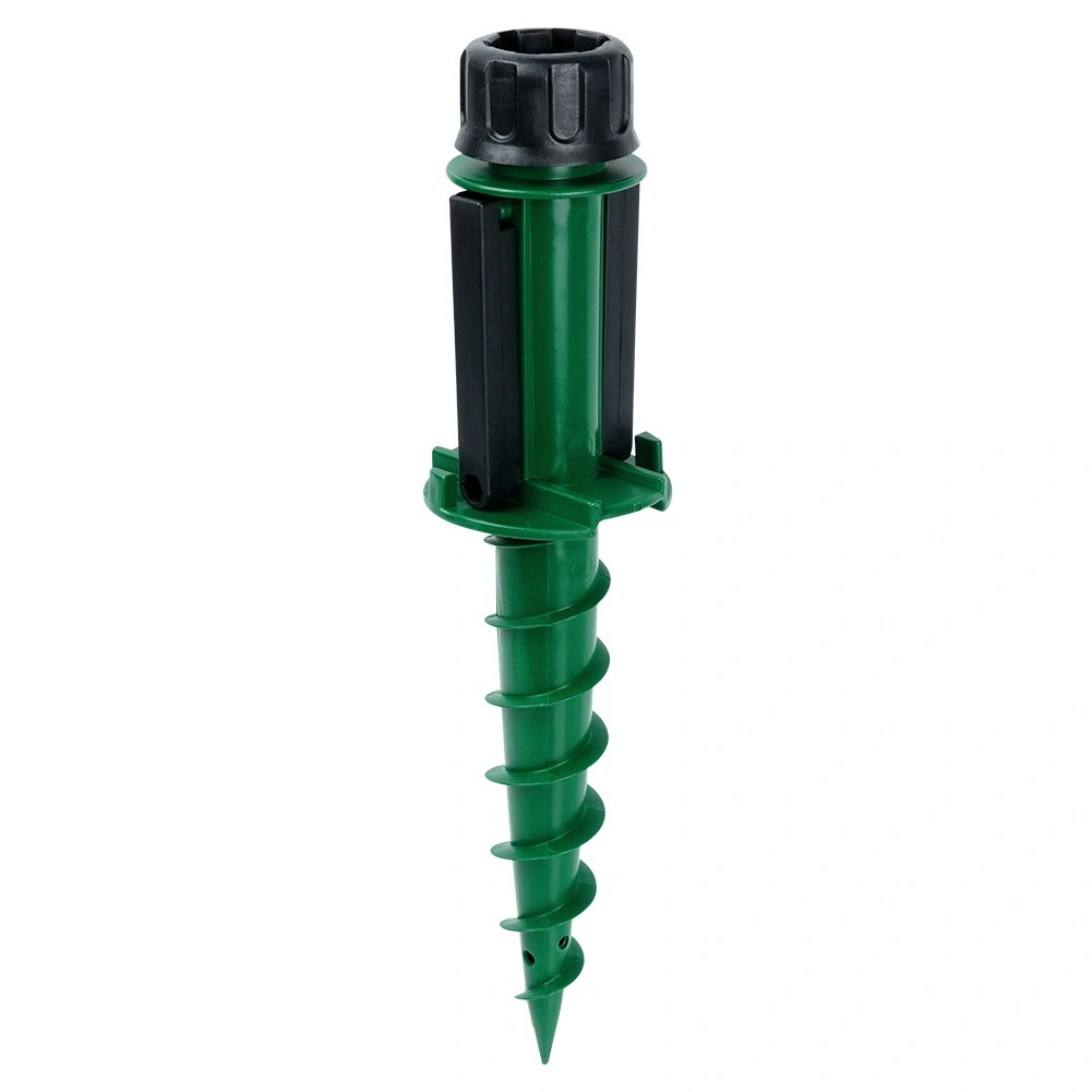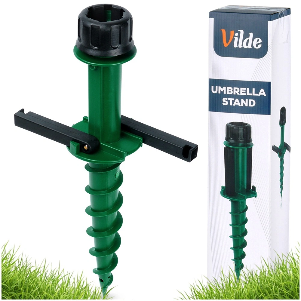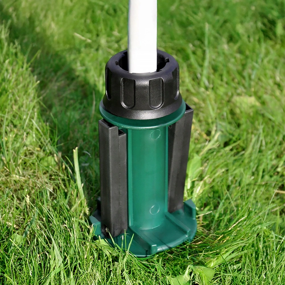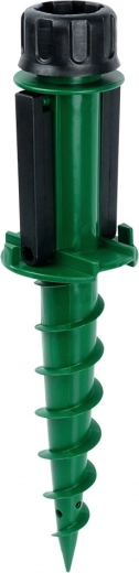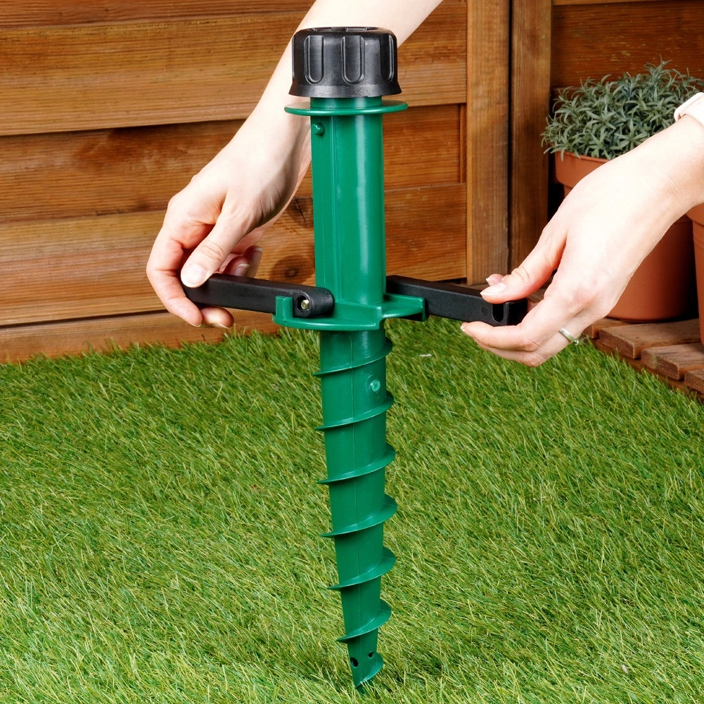 A felső szorítóbilincs illeszkedik a napernyőrúdak szokásos átmérőihez (kb. 2,2–3,3 cm), és biztonságosan a helyén tartja azokat. A oldalsó felhajtható fogantyúk megfelelő erőkart adnak a könnyű becsavarozáshoz és a földből való kiemeléshez. Ideális választás kertbe, strandra, nyaralóba és kempingezéshez – nehéz beton talpak nélkül.