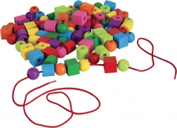 A fa gyöngyök különböző formákban, például gömbök és kockák, és élénk színekben érkeznek, ami segít a gyermekeknek a színek felismerésében.