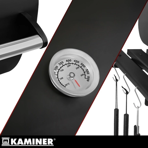 A robusztus KAMINER kerti faszenes grill stabil hőmérsékletre és kényelmes főzésre készült családnak és barátoknak. A fedélbe épített hőmérő és a levegőszabályozó rendszer (kémény, keringtető nyílások és zsaluk) egyenletes izzást, egyformán átsült ételeket, valamint közvetett grillezést vagy enyhe füstölést tesz lehetővé.