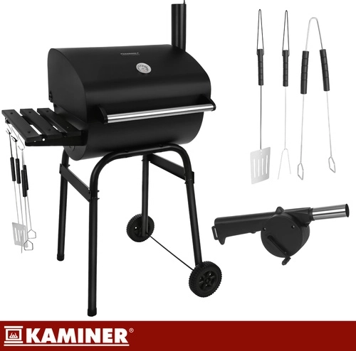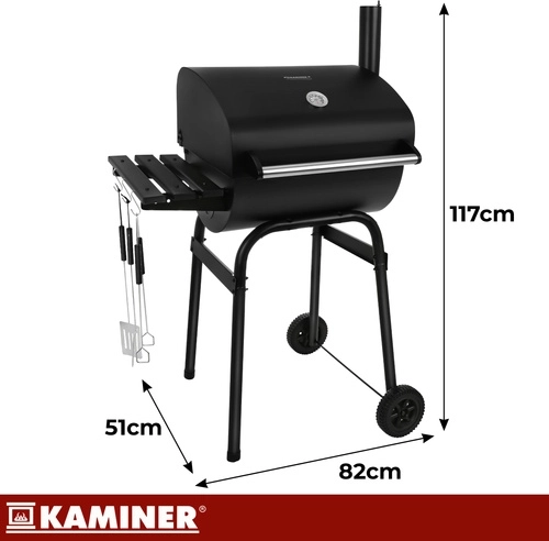 Élvezze a kényelmes grillezést a KAMINER fedeles, beépített hőmérővel ellátott grilljével. A masszív, 1 mm vastag acélszerkezetnek, a nagy, dupla krómozott rácsnak és a pontos levegőszabályozásnak köszönhetően mindig kézben tarthatja a hőt és az eredményt. A csomag része a rozsdamentes szénfiók és a praktikus grillező tartozékok.