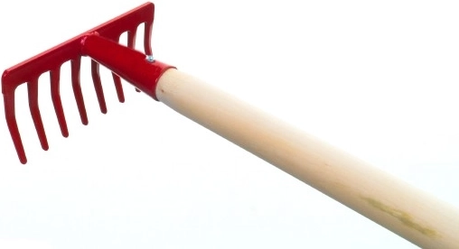 A masszív fém fogak megbirkóznak a lombbal és a talaj enyhe elegyengetésével is, miközben a szerszám könnyű marad a gyerekek számára.