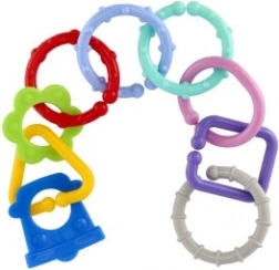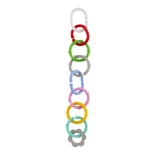 A karikák és formák egyszerűen összekapcsolhatók és stabilan tartanak, így a gyerekek láncokat készíthetnek, illetve játékokat rögzíthetnek babakocsira vagy autósülésre.