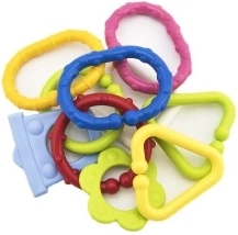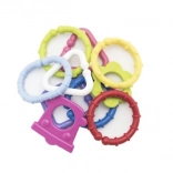 Ez a színes műanyag formakészlet ideális első játék babáknak. Az elemek könnyen összepattinthatók és stabilan tartanak, így a gyerekek újra és újra készíthetnek láncokat és egyszerű szerkezeteket. A különböző textúrák és színek gazdag érzékszervi ingereket nyújtanak, a csörgő hatás pedig leköti és megnyugtatja a kicsiket.