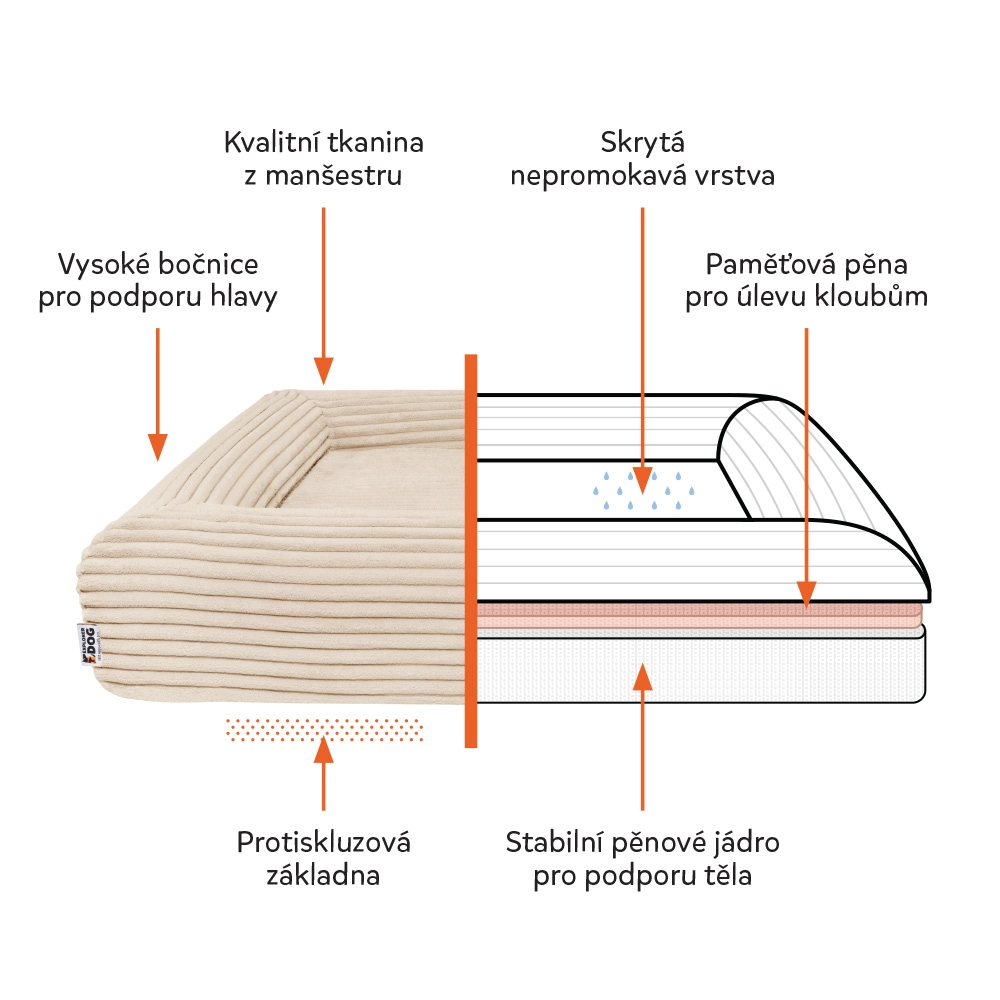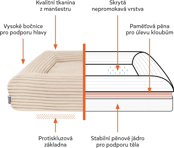 A finom kordbársony huzat (100% poliészter) puha, gyorsan száradó és szagálló, OEKO-TEX Standard 100 tanúsítvánnyal. A CertiPUR-US tanúsított habmag nem tartalmaz káros anyagokat. A YKK cipzáraknak köszönhetően a huzat könnyen levehető és 30 °C-on mosható. A vízálló belső réteg óvja a magot a nedvességtől, a csúszásgátló alsó rész pedig stabilan tartja a fekhelyet járólapon és laminált padlón is.