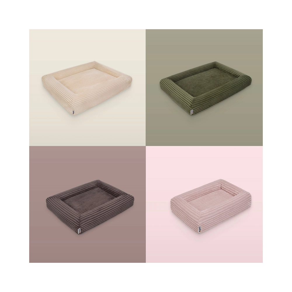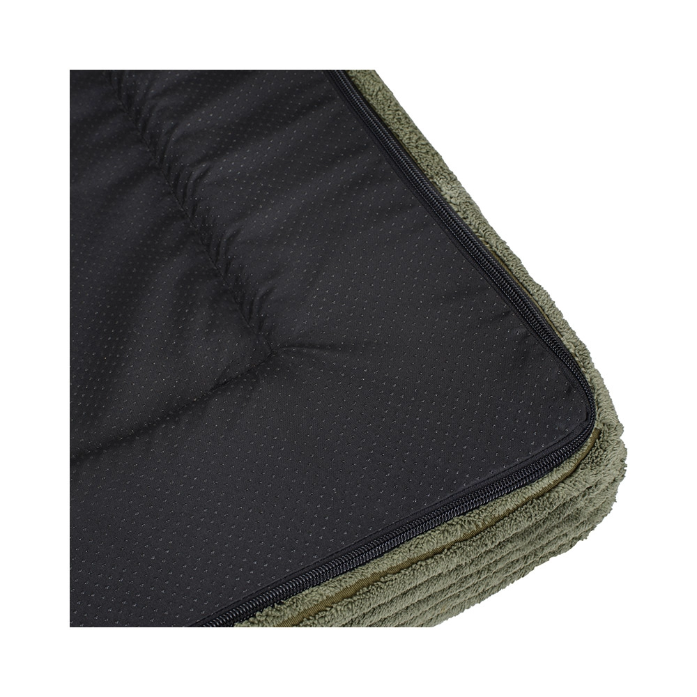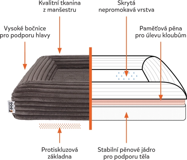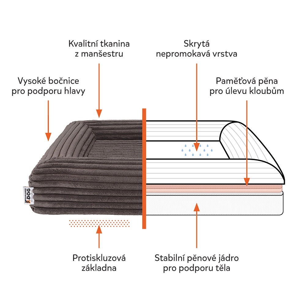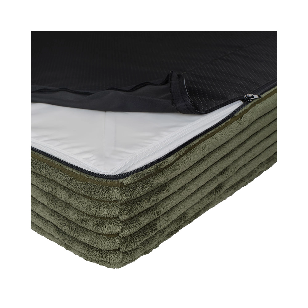 A puha kordbársony huzat (100% poliészter) OEKO-TEX Standard 100 tanúsítvánnyal tartós, gyorsan szárad és kevésbé veszi át a szagokat. A YKK cipzárakkal könnyen levehető és 30 °C-on gépben mosható. A vízálló belső réteg megóvja a habmagot a nedvességtől és szennyeződésektől, míg a csúszásgátló alsó oldal stabilan tartja a fekhelyet még a sima padlókon is.