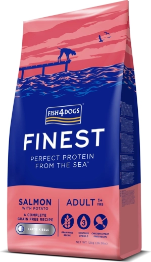 A Fish4Dogs kiegyensúlyozott száraztápja nagytestű felnőtt kutyáknak elsőrangú állati fehérjeforrásra épül – a norvég lazacra. A lazac és burgonya kombinációja kiváló emészthetőséget, természetes ízletességet és optimális tápanyagarányt biztosít a mindennapi vitalitáshoz.