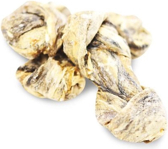 Minden darab 100% fehérhal-bőrből készül, amely gazdag fehérjében és értékes omega–3 zsírsavakban. A falatok ropogósak, csábítóak és könnyen emészthetők. A méretbeli eltérések a termék természetes sajátosságai – mindig válasszon kutyájának megfelelő méretű csomót, és etetés közben felügyelje.