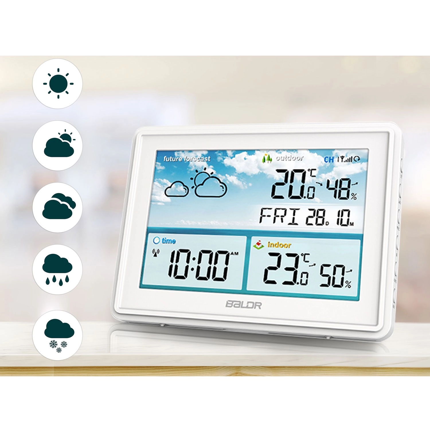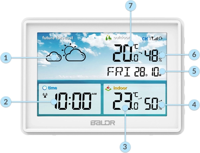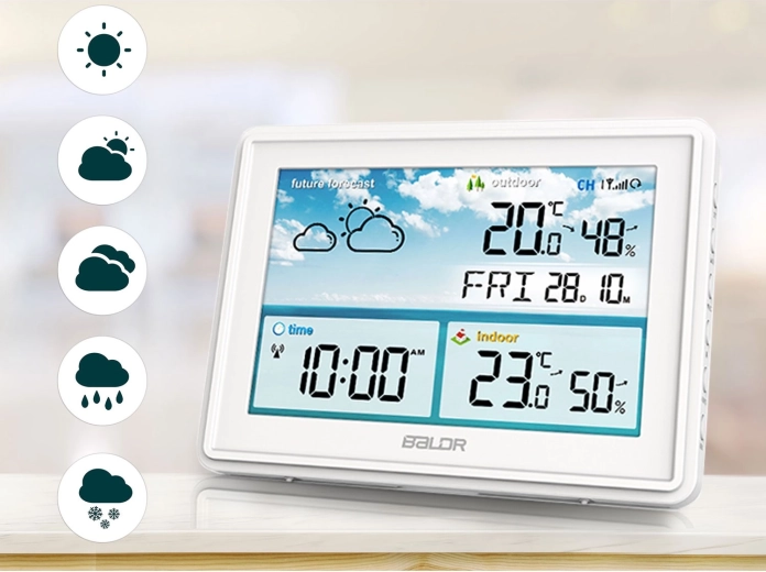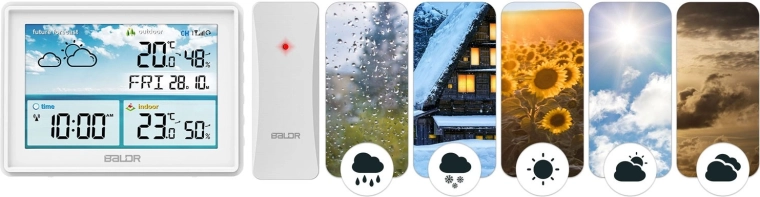 A nagy LCD éles ikonokkal jeleníti meg az aktuális állapotot és a 12 órás időjárás-előrejelzést. Minden kulcsadat – hőmérséklet, páratartalom, idő és dátum – egy pillantással leolvasható.