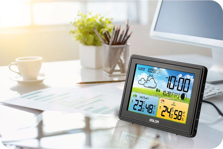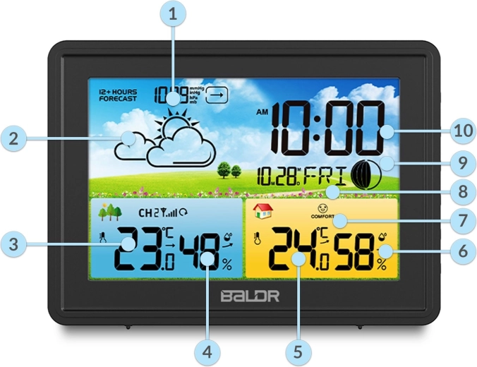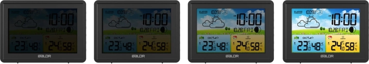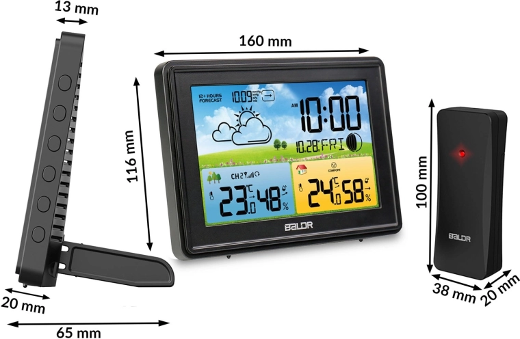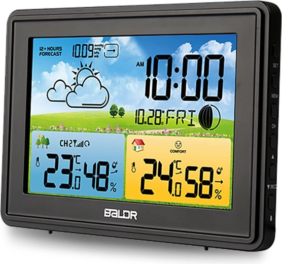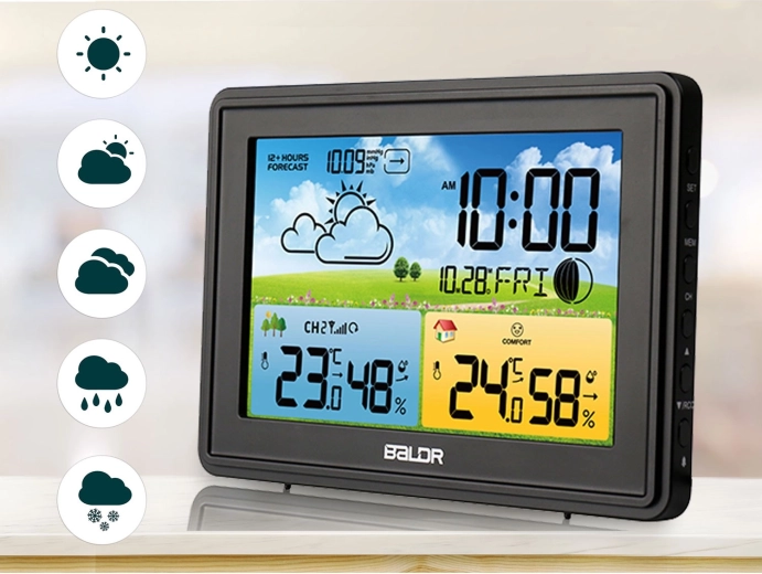 Modern vezeték nélküli meteorológiai állomás színes LCD-vel, 12 órás előrejelzéssel és DCF77 automatikus időszinkronizálással. Mér benti és kültéri hőmérsékletet és páratartalmat, megjeleníti a barometrikus nyomást, a Hold fázisait, a komfortszintet, és ébresztőórát szundival kínál. A háromszintű fényerőnek köszönhetően nappal és éjjel is kiválóan olvasható.
