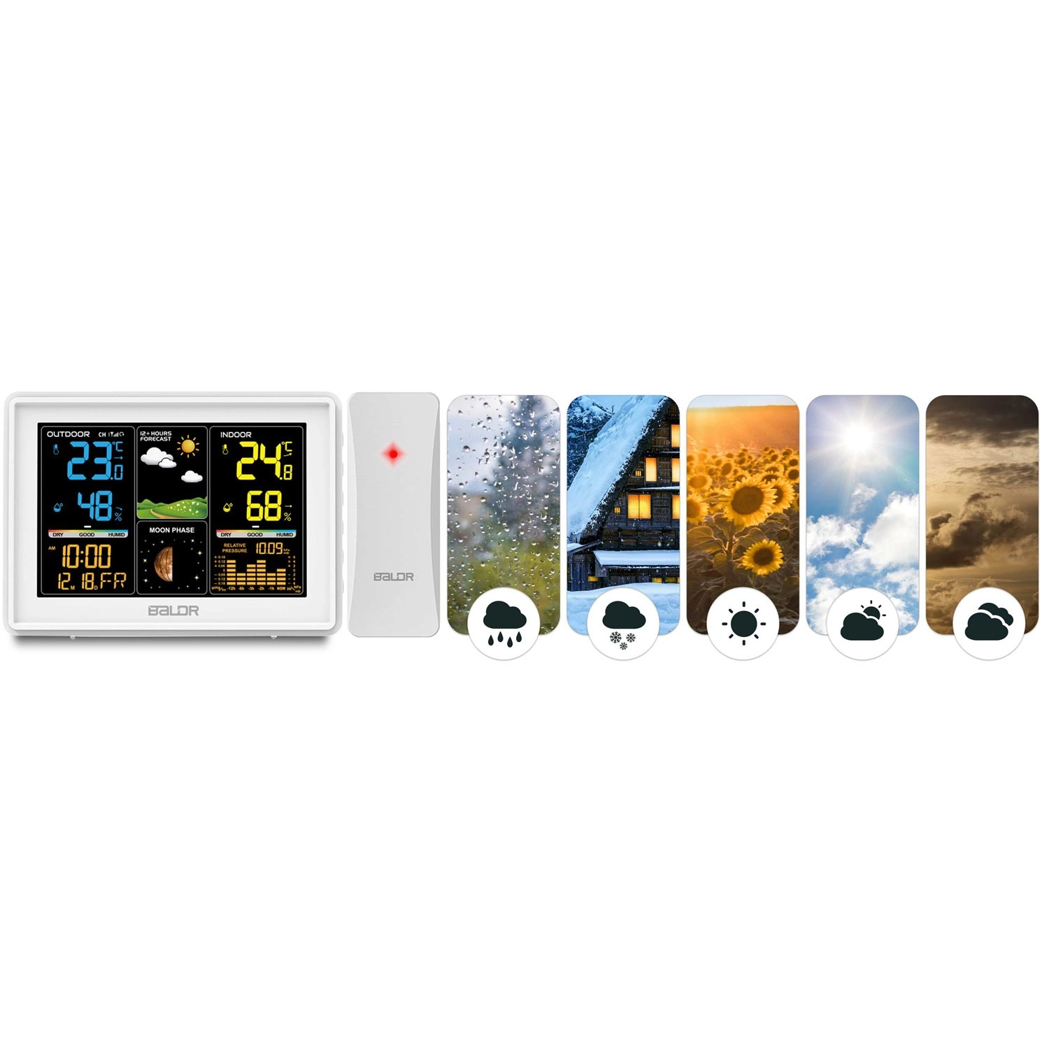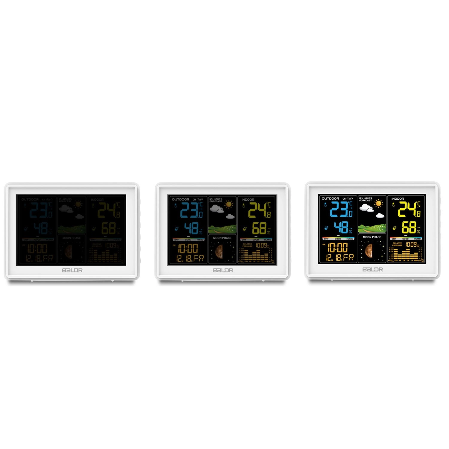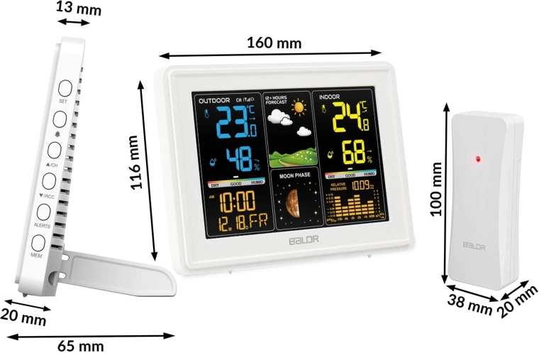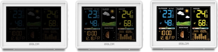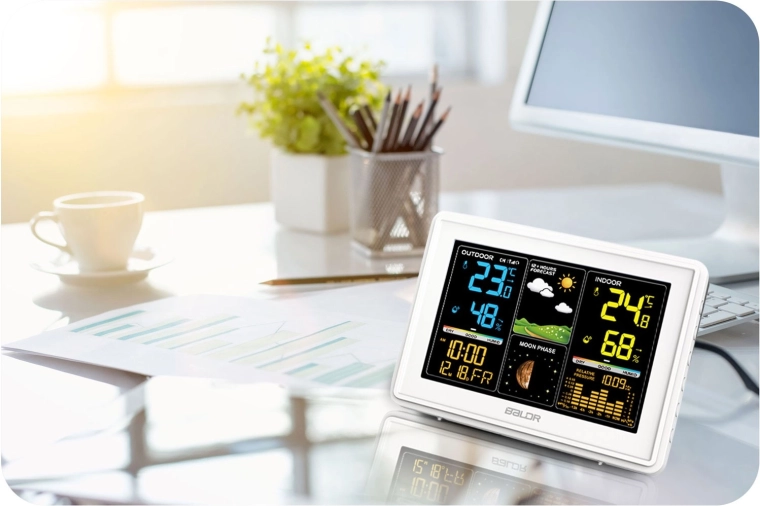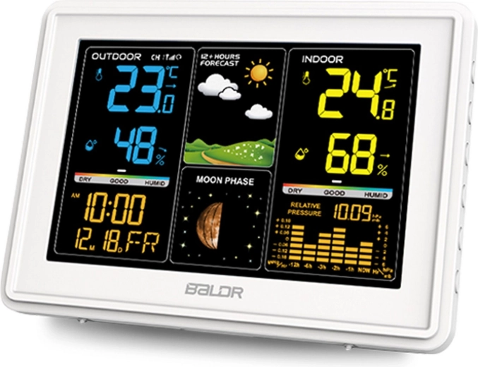 Ez az elegáns, fehér meteóállomás teljes képet nyújt az időjárásról és az otthoni klímáról. A hőmérséklet, páratartalom és légnyomás folyamatos mérésének köszönhetően helyi 12–24 órás előrejelzést jelenít meg, és a DCF77 segítségével mindig pontosan beállítja az időt és a dátumot. A nagy, színes LCD kiválóan olvasható, a háttérvilágítás 3 szinten (100/50/10%) csökkenthető, vagy teljesen kikapcsolható.