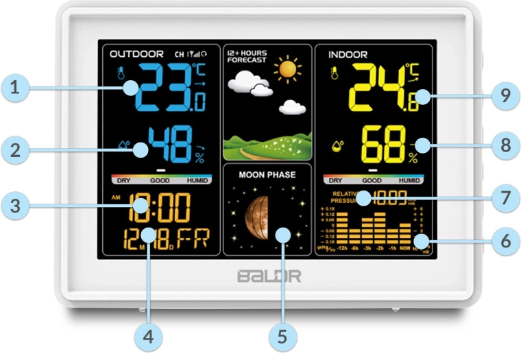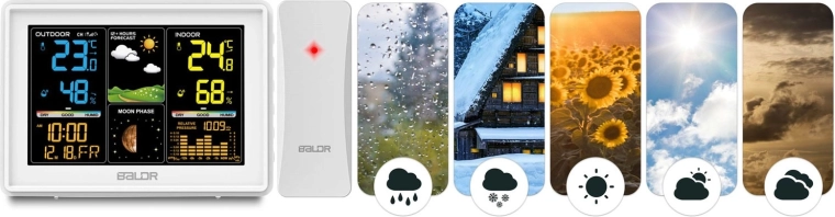 Az állomás folyamatosan értékeli a hőmérsékletet, páratartalmat és nyomást, és helyi előrejelzést nyújt ikonokkal és trenddel. Így előre tudhatja, hogyan alakul az időjárás.
