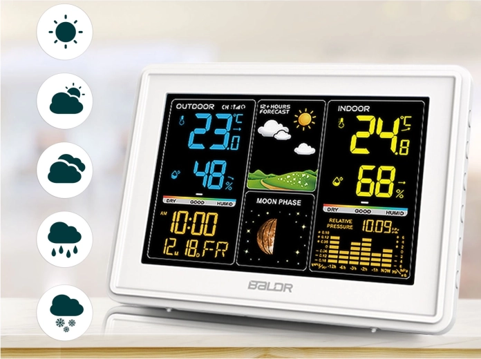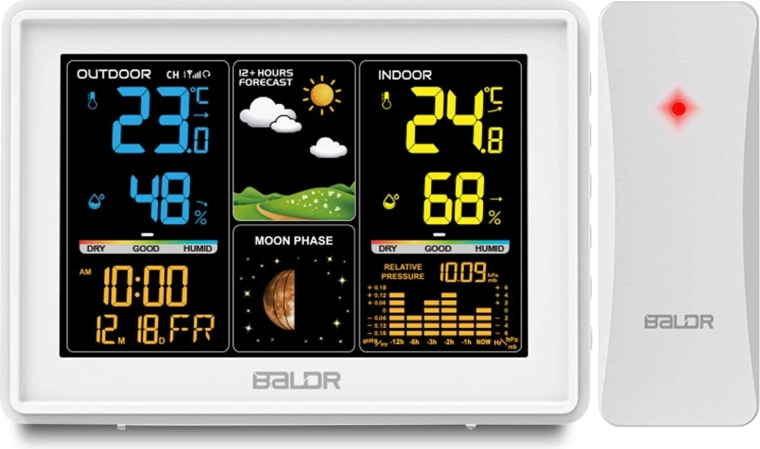 Modern otthoni meteorológiai állomás színes LCD-vel, vezeték nélküli kültéri érzékelővel és DCF77 automatikus időszinkronizálással. 12–24 órás előrejelzést kínál, megjeleníti a hőmérsékletet és páratartalmat beltéren és kültéren, barométert történelemmel, a Hold fázisait, ébresztőt szundi funkcióval és háromlépcsős háttérvilágítást. Ideális az otthoni klíma ellenőrzésére a pontos higrométernek és az áttekinthető kijelzőnek köszönhetően.