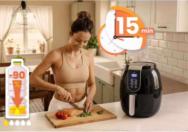 A forró levegő keringése aranybarna kérget és szaftos belsőt biztosít – a hasábburgonya, a csirke, a zöldségek és a pékáruk könnyebbek és ízletesek lesznek, akár 90%-kal kevesebb zsírral, mint az olajban sütésnél.