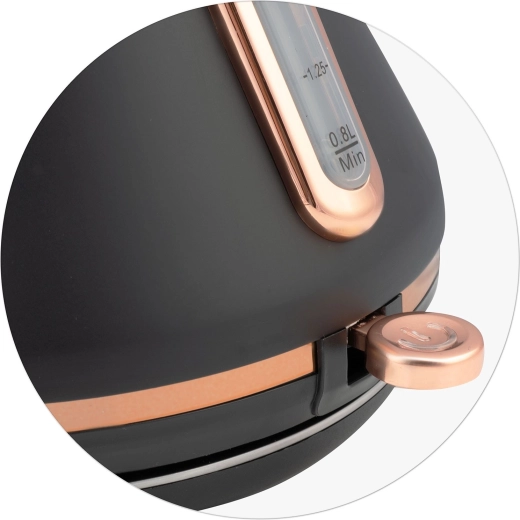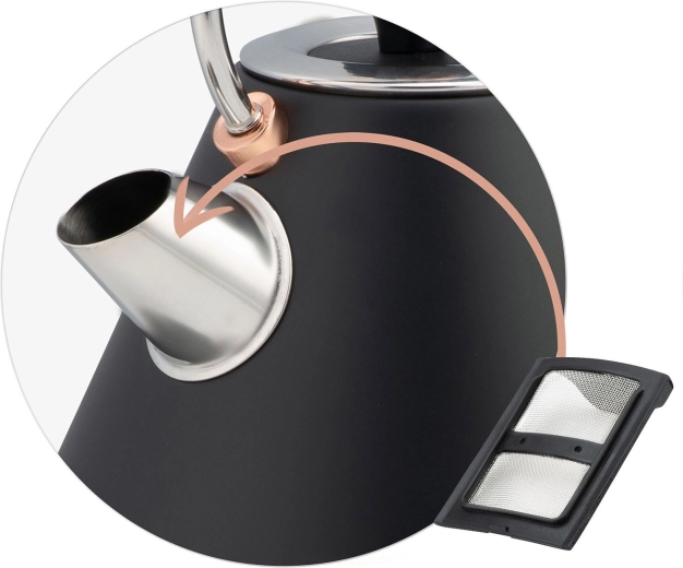 A vízforraló gyors felfűtést kínál 1850–2200 W teljesítménnyel, 360°-ban forgatható talpat jobb- és balkezeseknek, valamint praktikus kábeltárolót. A kifolyóban lévő vízkő elleni fém szűrő felfogja a lerakódásokat, míg a szárazonfutás elleni védelem és a megvilágított kapcsoló növeli a biztonságot és a kényelmet.