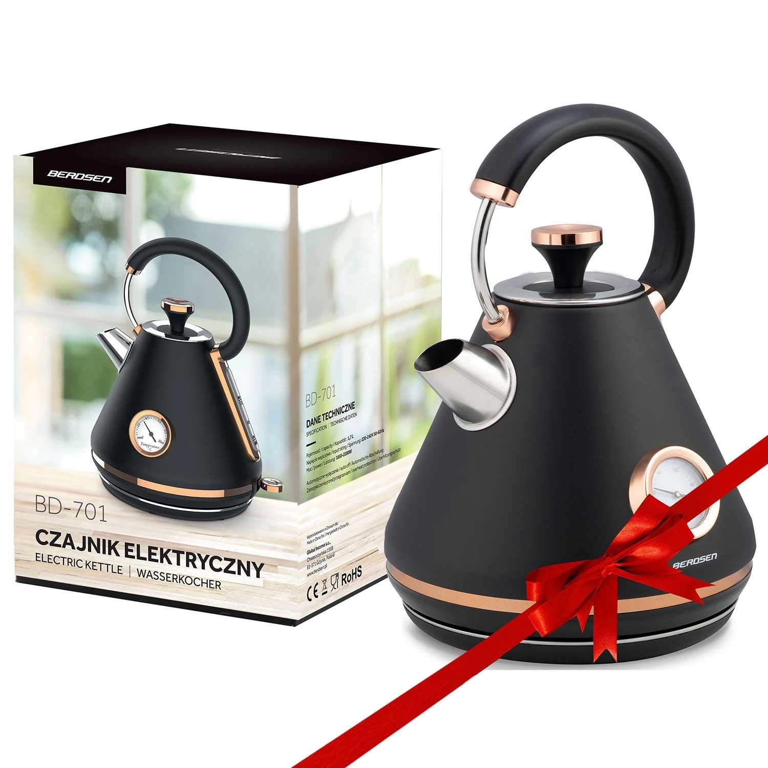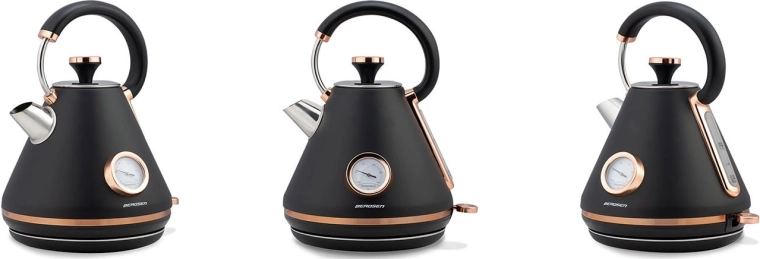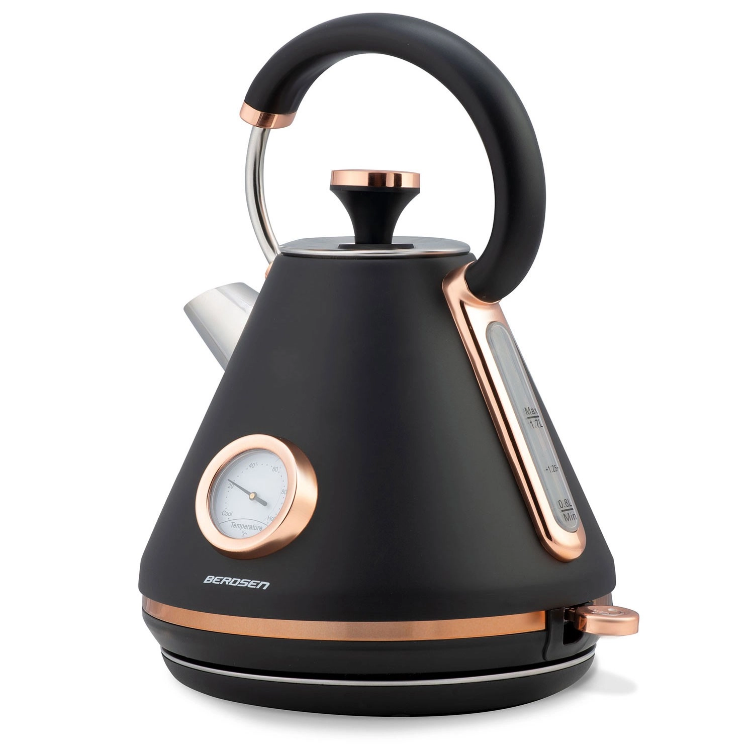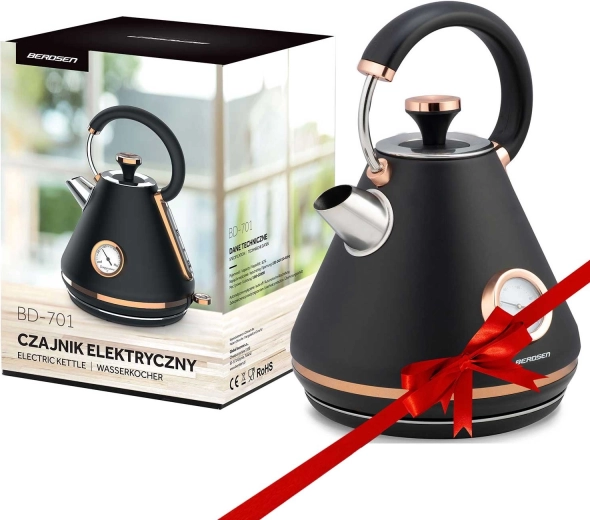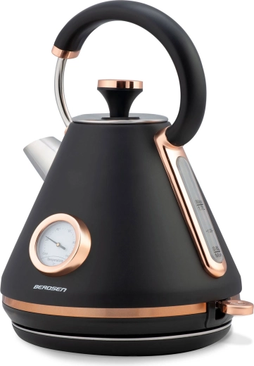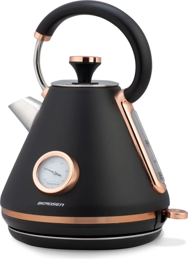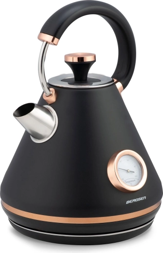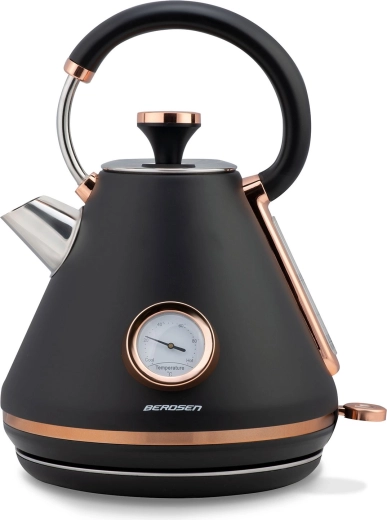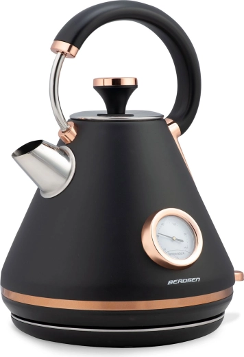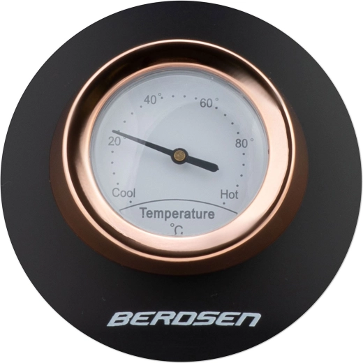 Stílusos retro Berdsen vízforraló 1,7 l beépített analóg hőmérővel a tea és kávé pontos elkészítéséhez. Matt felületű fémházzal, 360°-ban forgatható talppal, megvilágított kapcsolóval, nem melegedő fogantyúval és kivehető vízkőszűrővel a tisztább vízért. A praktikus levehető fedél, a vízszintjelző és a csúszásgátló lábak kényelmes és biztonságos használatot biztosítanak.