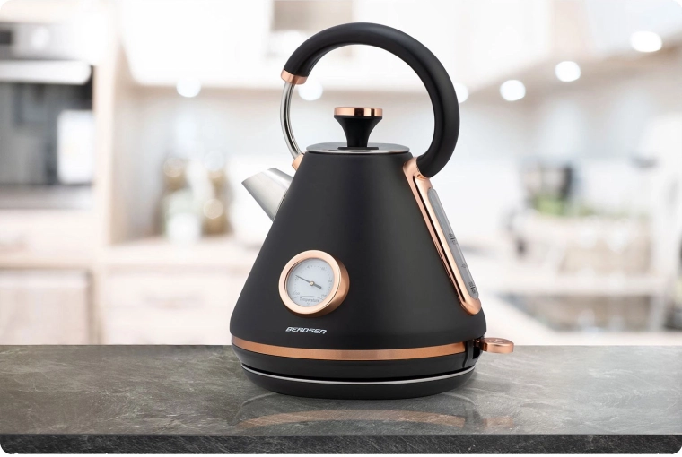 Dobja fel konyháját az elegáns, 1,7 literes retro Berdsen vízforralóval. A beépített hőmérőnek köszönhetően egyszerűen választhatja ki az ideális hőfokot zöld teához, kávéhoz vagy gyógyteákhoz. A matt fém kivitel könnyen tisztítható és prémium megjelenést kölcsönöz a belső térnek.