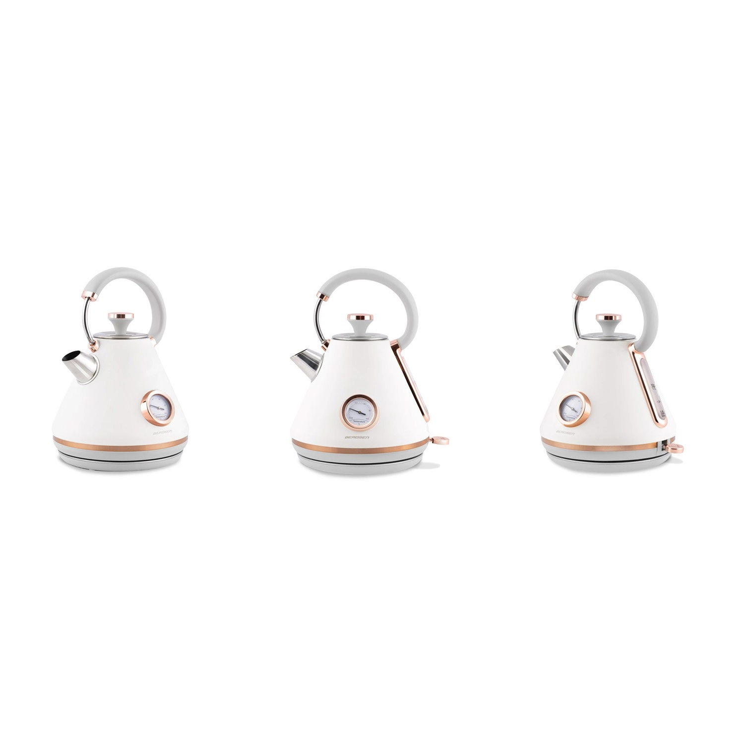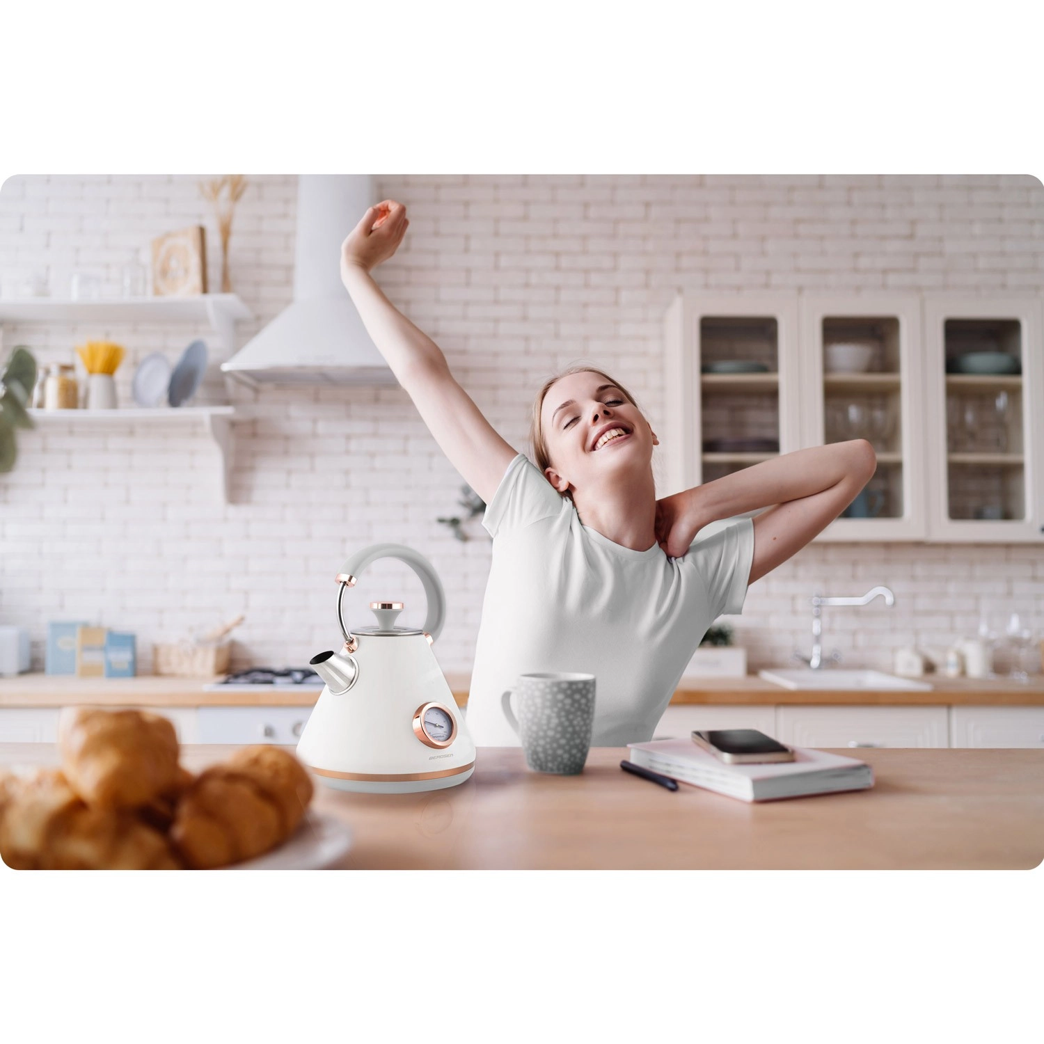 - Dizájn: időtlen retro stílus törtfehér árnyalatban rózsaarany akcentusokkal – elegáns kiegészítő a konyhába.