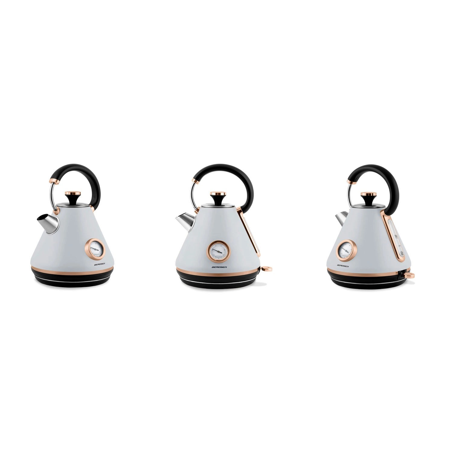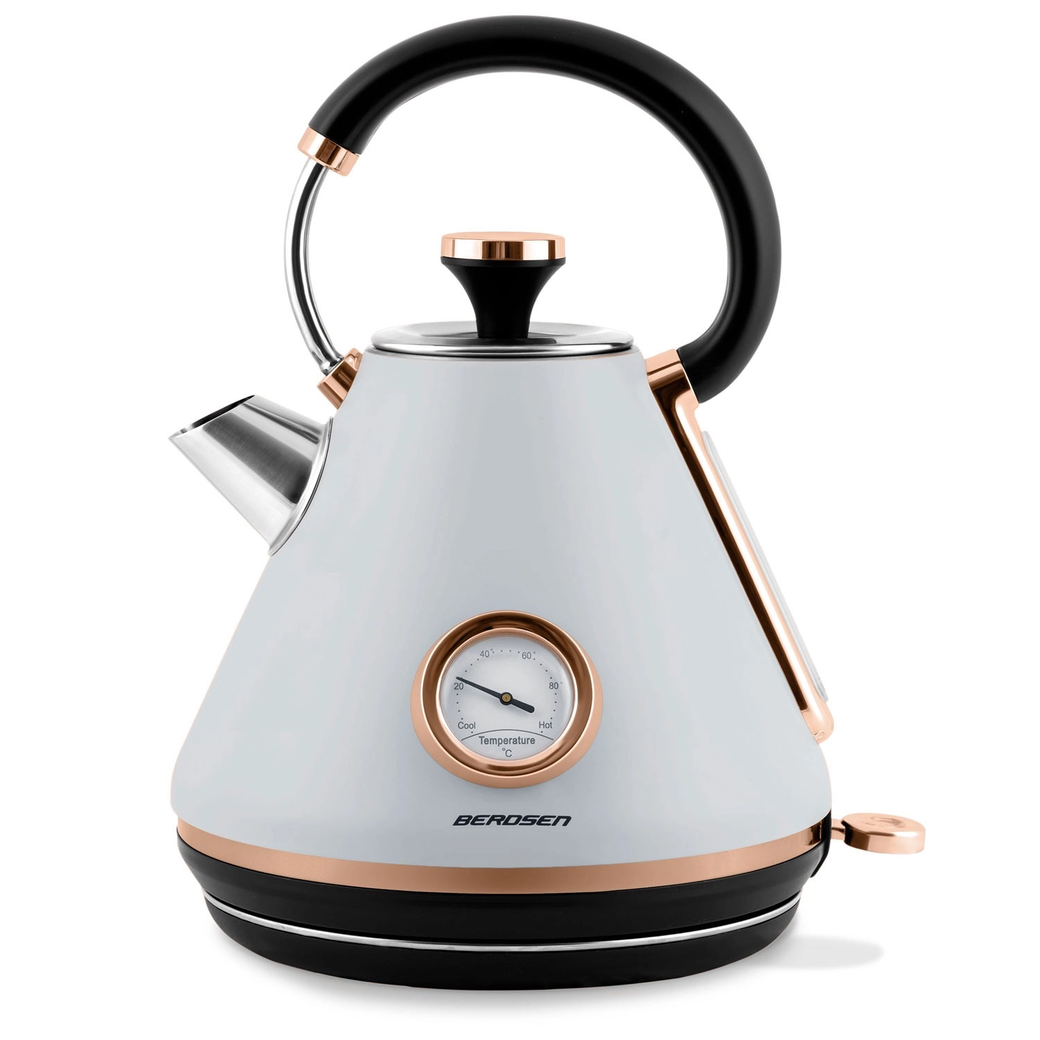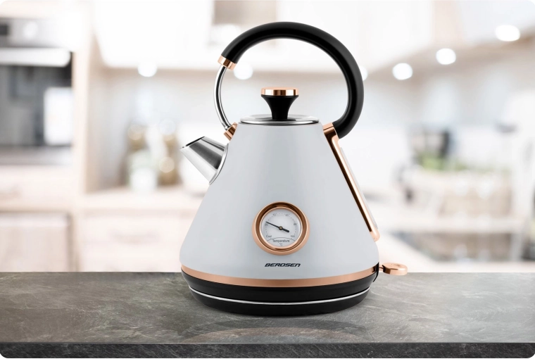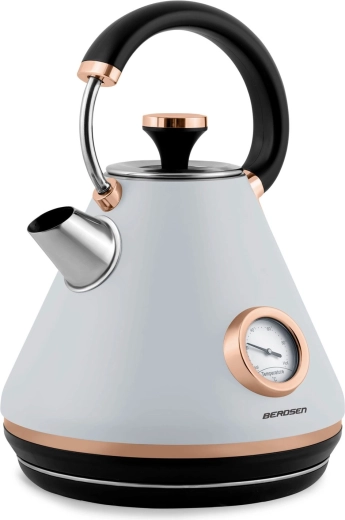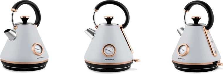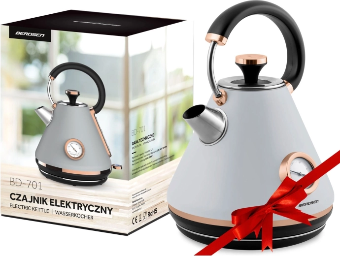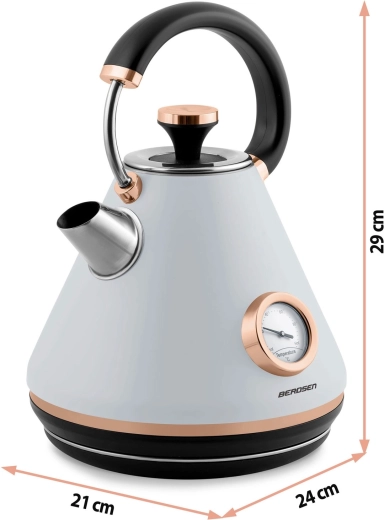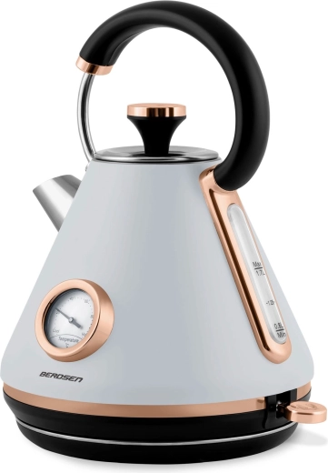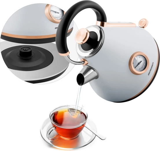 Stílusos, retro dizájnú, 1,7 l űrtartalmú elektromos vízforraló a BERDSEN márkától, amely gyors vízmelegítést, pontos szabályozást biztosít a analóg hőmérőnek köszönhetően, és kényelmes használatot nyújt a 360°-ban forgatható talp, a nem melegedő fogantyú és a világító kapcsoló révén. A matt felületű fémház, a kivehető vízkőszűrő és a szárazonfutás elleni védelem hosszú élettartamot és biztonságos működést garantál.